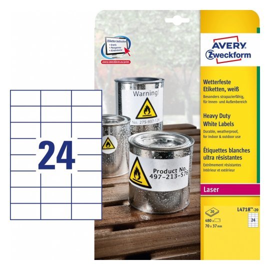 Avery L4718-20, Blanco, Etiqueta para impresora autoadhesiva, A4, Espuma, Poliéster, Laser/Inyección de tinta, Permanente