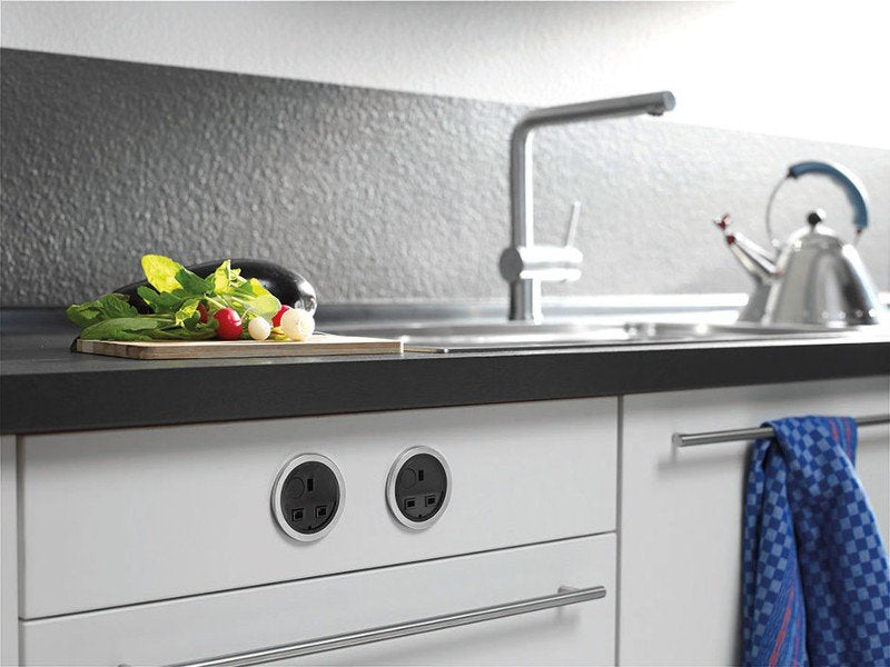La serie de diseño PIX incluye una colección de unidades de toma de corriente y conexión circulares que pueden utilizarse a voluntad.
