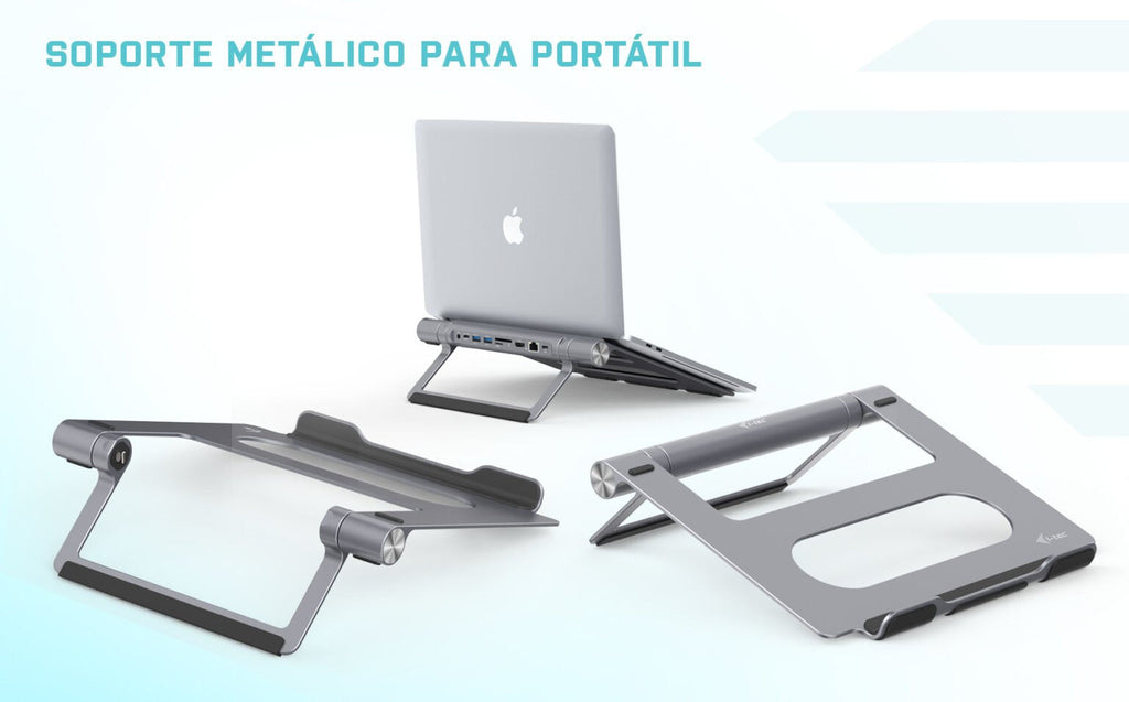 - El soporte basculante permite ajustar cómodamente la altura de trabajo del portátil