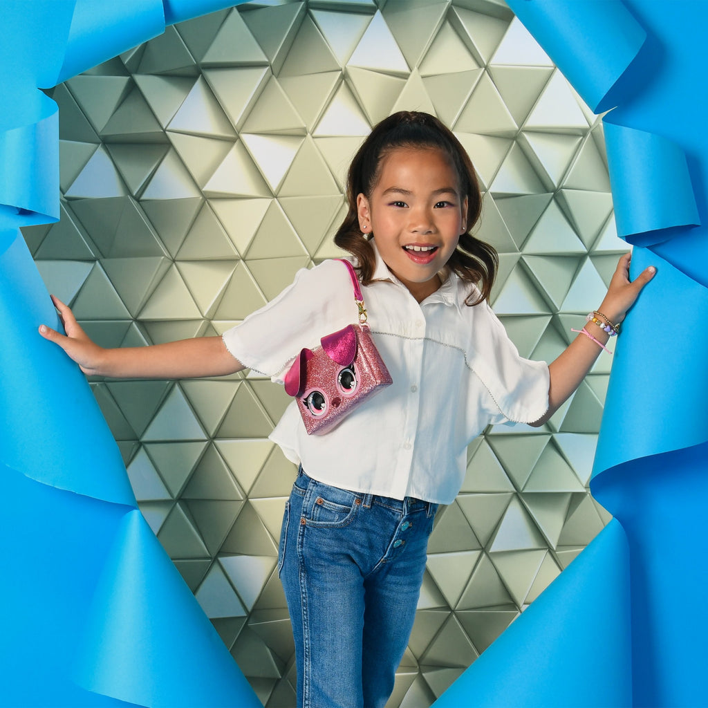 Expresa tu estilo con los bolsos para niñas Keepin' It Clutch de Purse Pets. Estos bolsos de mano son un gran regalo para niñas y tienen detalles resplandecientes y ojos que se iluminan. Cuando estés fuera de casa, pulsa la nariz de Dazzling Diva para elegir un color de ojos que combine con tu estado de ánimo o tu ropa. También puedes pulsársela para que los ojos pasen de un color del arcoíris a otro. Si quieres descubrir más formas de jugar, mantén pulsada la nariz de Dazzling Diva para activar el modo enamoramiento y observa cómo los ojos se le iluminan en color rosa. Dazzling Diva presenta un suave tejido de color rosa resplandeciente, orejas de cachorro caídas de color rosa metalizado, ojos inspirados en el pop art y una cremallera metálica. Engancha la correa de 33 cm a un lado del bolso para llevar a tu amiga de Purse Pets en la muñeca, o bien engancha la correa y extiéndela para transportar a Dazzling Diva como un bonito bolso. Mide aproximadamente 7,5 (Al.) x 15 (An.) x 2,5 (Fon.) cm e incluye 3 pilas LR44. Si bien los expresivos ojos se iluminan, este bolso rosa no parpadea ni emite sonidos. Los juguetes interactivos de Purse Pets son un regalo formidable para cumpleaños, Navidad (incluso para rellenar calcetines navideños) o cualquier otra ocasión especial para niñas. Ilumina tu look con Dazzling Diva de Purse Pets.