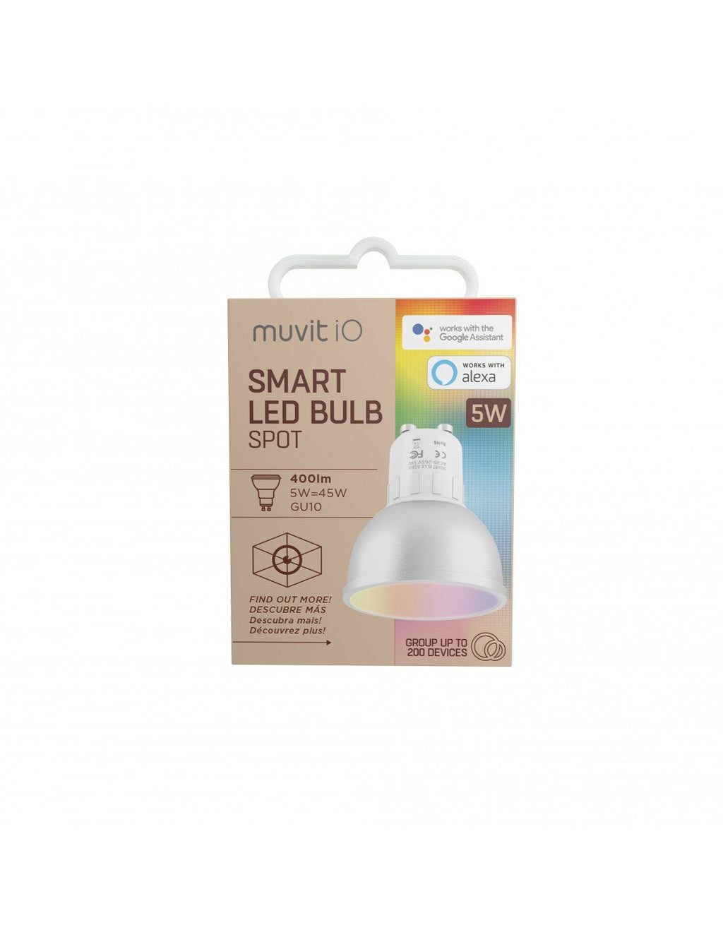 La bombilla inteligente GU10 de muvit iO ofrece iluminación inteligente para toda la casa. Se conecta al Wi-Fi de la red doméstica y se puede controlar el color y la intensidad a través del móvil (iOS y Android). Es compatible con Google Home y Amazon Alexa.