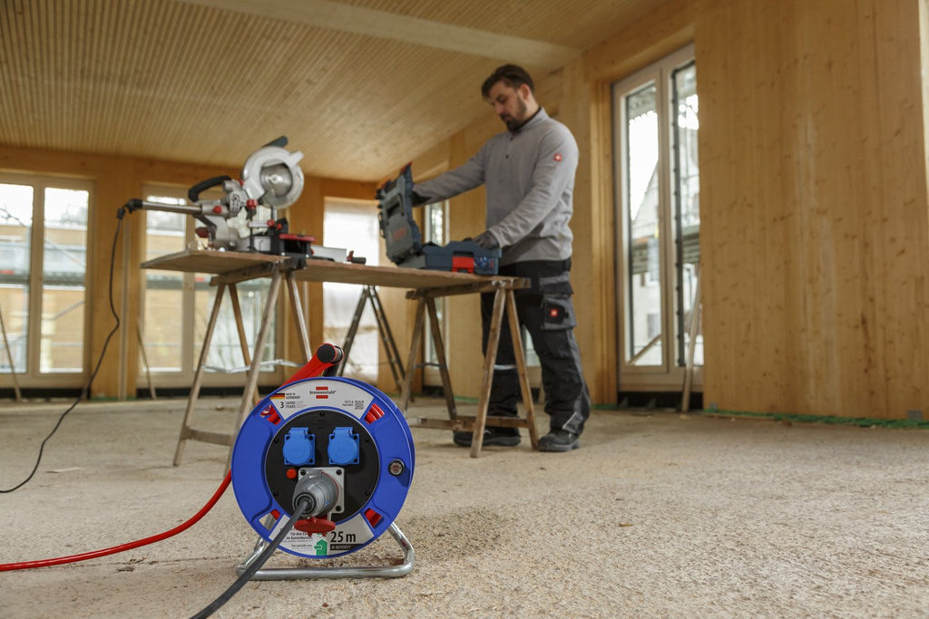 Brennenstuhl 1182770010, 25 m, Exterior, IP44, Resistente a la abrasión, Resistencia al frío, Resistente al aceite, Resistente a radiación UV, Plástico, Negro, Azul, Gris, Rojo