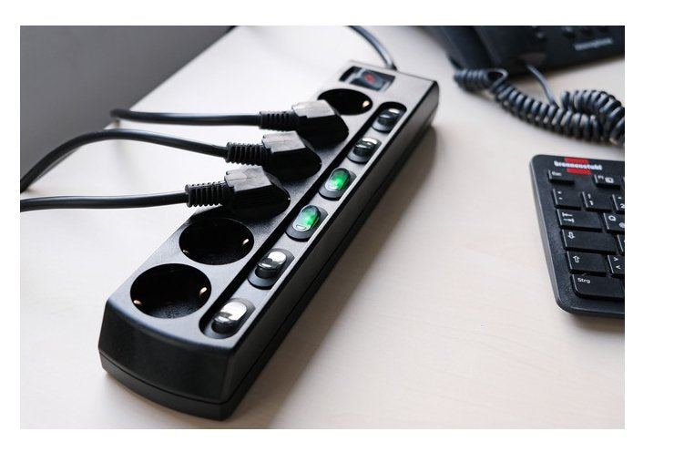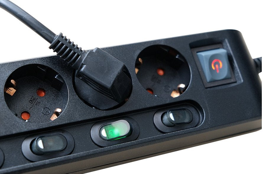 - Conmute fácilmente hasta 6 dispositivos diferentes por separado. 1 interruptor principal de 2 polos y 6 conmutadores, también de 2 polos.