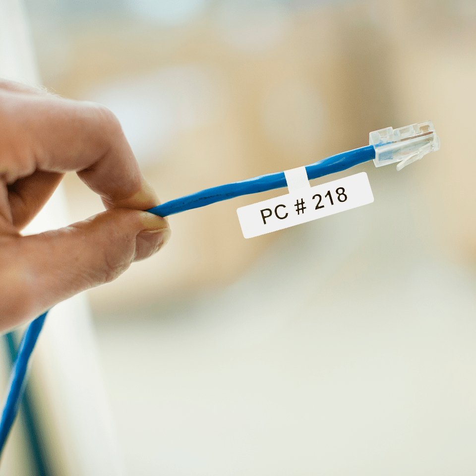 Diseñada para la identificación de cables y conectores, las etiquetas precortadas hacen que sean muy fáciles de aplicar una vez impresas. Al crear la etiqueta, la información se imprimirá en dos cuerpos que se adhieren al colocarlos sobre el cable.