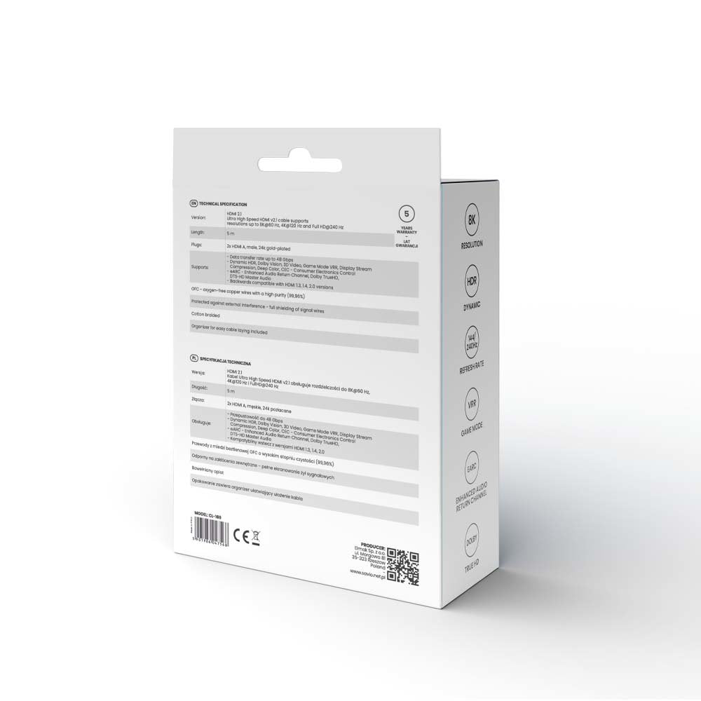 El cable HDMI SAVIO CL-169 de 5 metros permite recibir contenido televisivo e imágenes en la máxima calidad posible. Es compatible con resoluciones FullHD, 4K y 8K, garantizando una imagen nítida, detallada y con gran profundidad de color.
