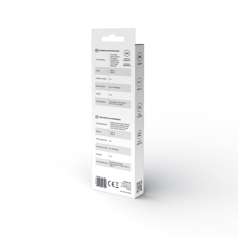 Savio USB cable 2 m USB 2.0 USB A - USB C White CL-168, 3 m, USB C, USB A, USB 2.0, 0,48 Gbit/s, Blanco