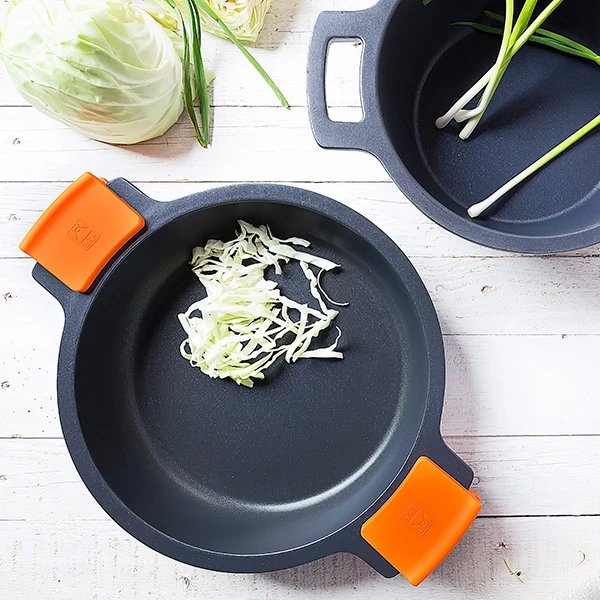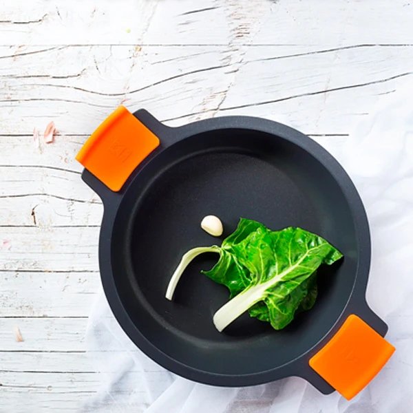Incluye tapa y dos asas de silicona en color naranja para coger la cacerola con comodidad.