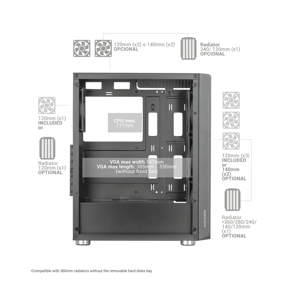 - MÁXIMA CAPACIDAD INTERNA: La semitorre gaming MC-3000 ofrece soporte para placas ATX, microATX y mini-ITX, hasta 5 discos duros con una cómoda bandeja extraíble y una gestión de cableado interno totalmente eficiente; Además, podrás instalar VGAs de hasta 305mm de largo (330mm sin ventilador frontal) y 167mm de ancho, así como disipadores de hasta 177mm de alto