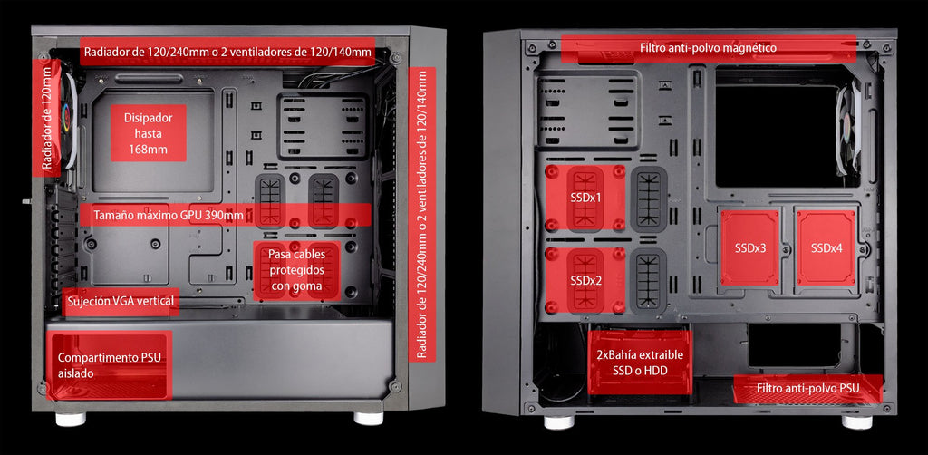 Cristal templado, Sujeción VGA incorporada, pasa cables protegidos con gomas, capacidad para 4 SSD y 2 HDD...