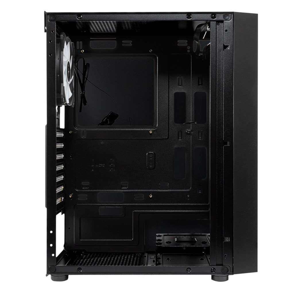 La caja ATX GLAYZE nos sorprende por la luz ARGB frontal, a pesar de ser una caja gaming sencilla. Posee un ventilador RGB en la parte trasera, y tiene capacidad de hasta 5 ventilador opcionales.