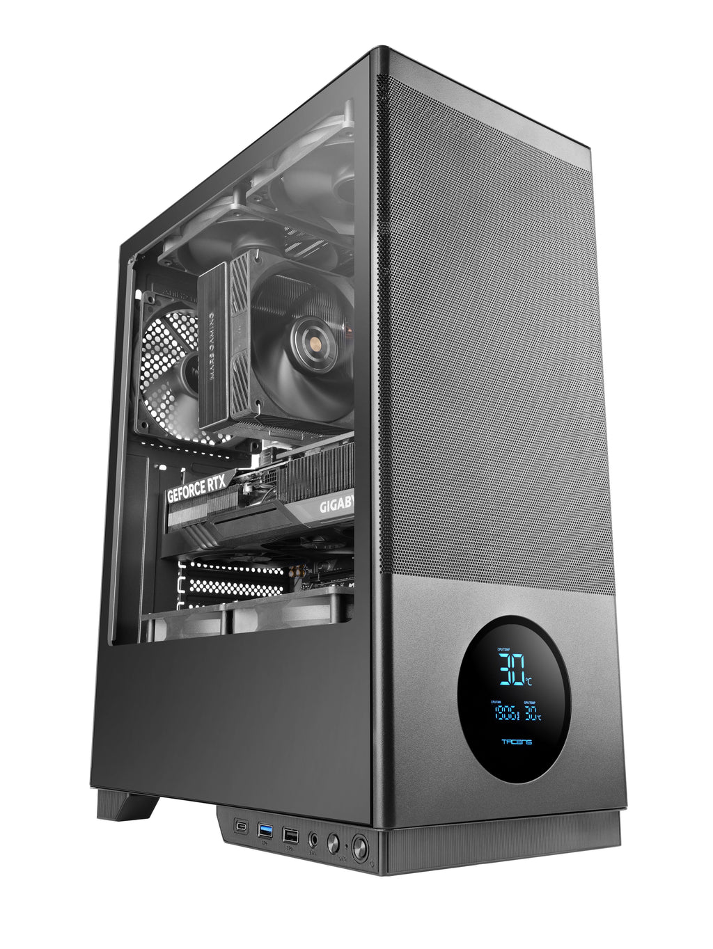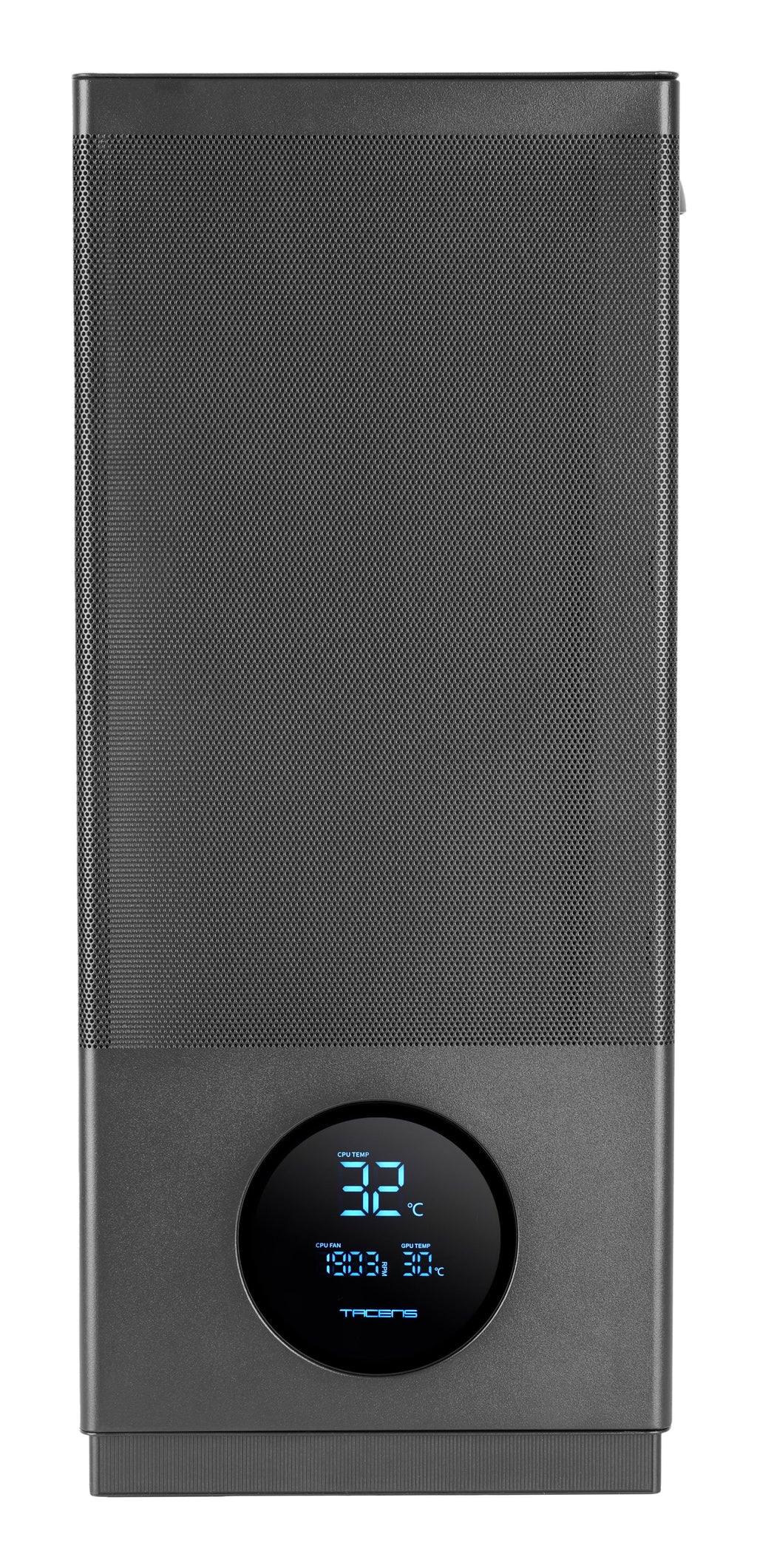 La pantalla circular del frontal muestra temperaturas de CPU y GPU y revoluciones del ventilador en tiempo real, para un control inmediato del sistema sin abrir software. Manteniendo la esencia de la caja Sagitta original lanzada hace 20 años, ahora con un look limpio y moderno.
