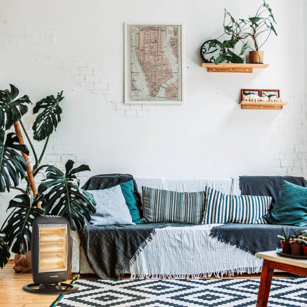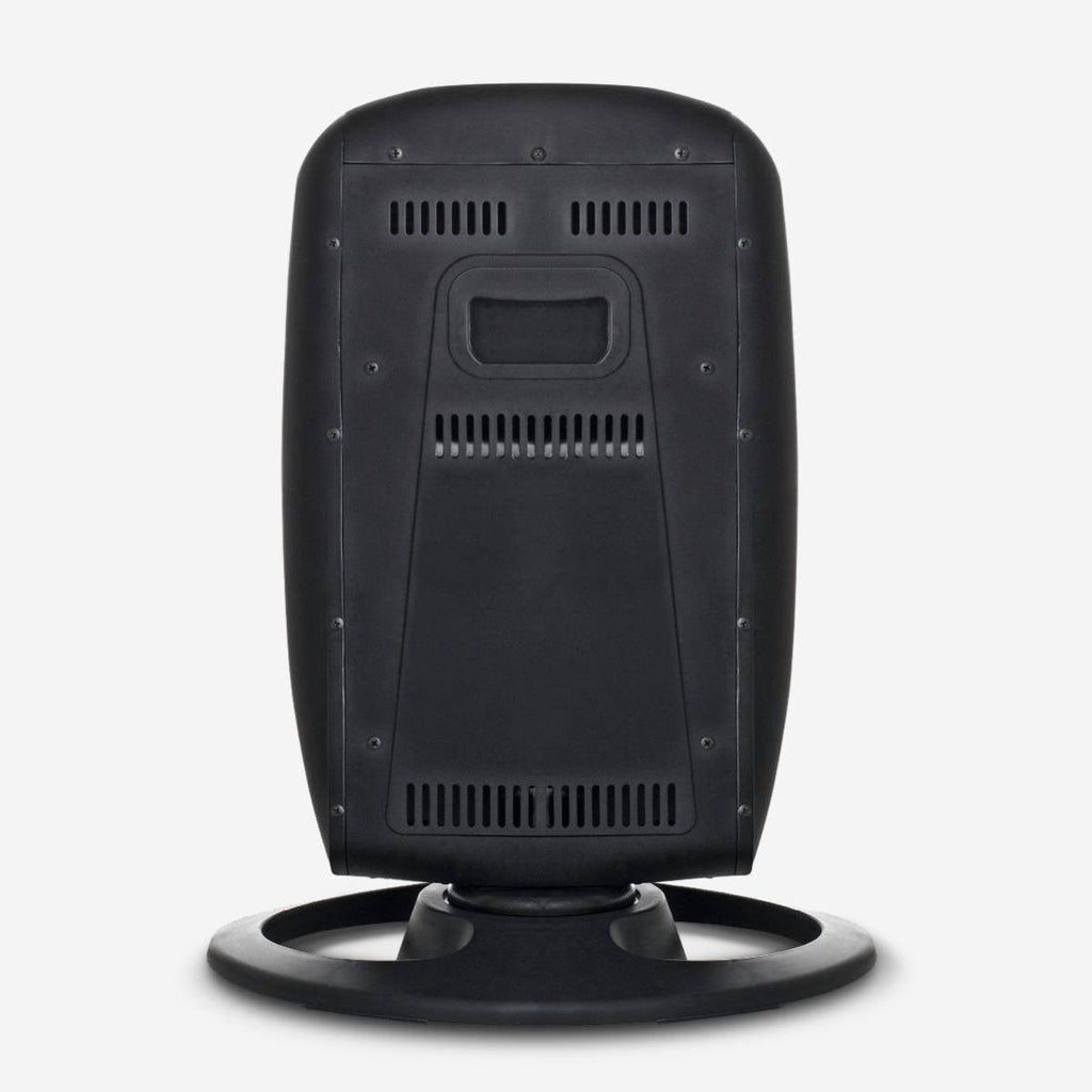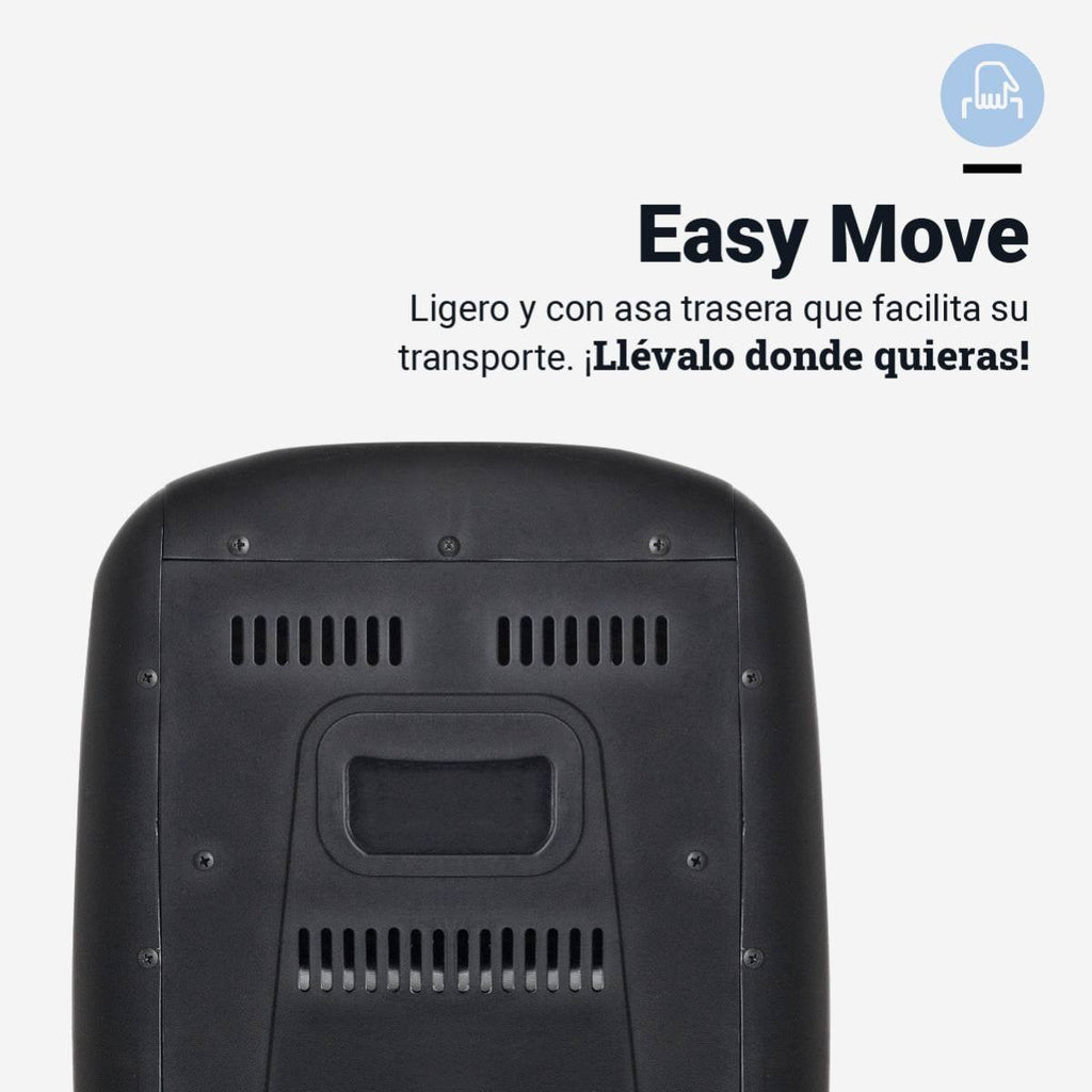 Calefactor halógeno de 1200 W, equipado con 3 niveles de potencia (400/800/1200W) y una base oscilante. Peso ligero y asa trasera para su fácil transporte. Base antivuelco y dispositivo de seguridad.