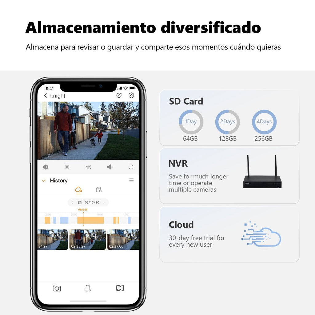 - Nube, tarjeta SD local o almacenamiento NVR