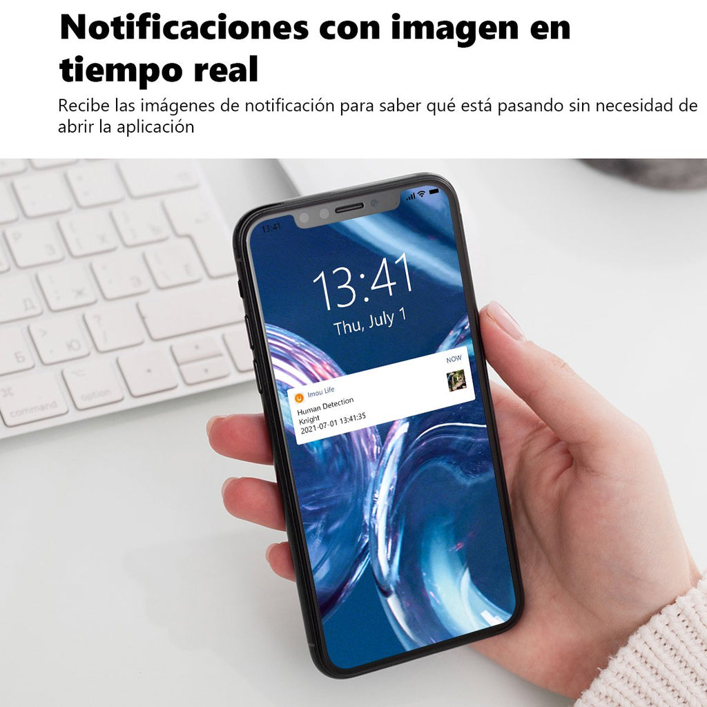 La lente de 8MP (UHD - 3840P) ofrece una excelente calidad de imagen para monitorear un patio delantero, un patio trasero o un garaje. La técnica de compresión de imágenes H.265 aplicada garantiza que las grabaciones y transmisiones de alta calidad ocupen relativamente poco espacio y, por lo tanto, requieran menos ancho de banda. De esta manera, el espacio de almacenamiento disponible y el ancho de banda se pueden utilizar de manera óptima. La cámara de seguridad Imou Knight utiliza Wi-Fi 6 de doble banda de 2,4 GHz/5 GHz. Además de la conexión inalámbrica, Imou Knight tiene un puerto Ethernet para conexión por cable.
