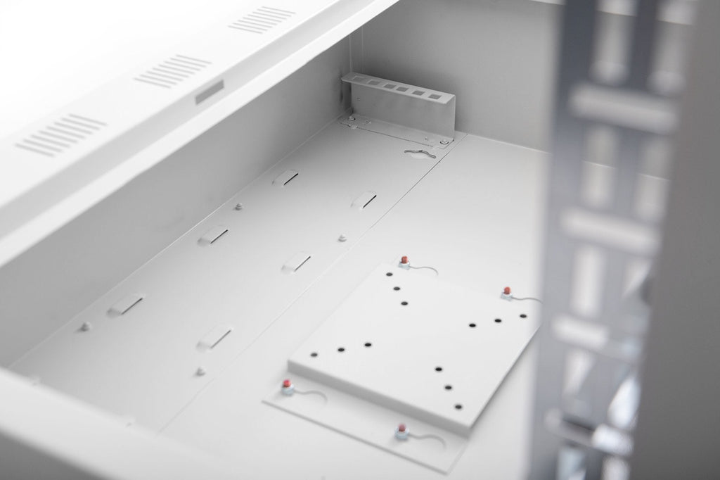 La carcasa de pared DIGITUS® protege su sistema de videovigilancia contra el acceso no autorizado. Es apta para todas las aplicaciones en ámbitos como redes, seguridad, DVR, sonido, radio o cableado. Los soportes de montaje le permiten montar su aparato fácilmente, tanto si es apto para 482,6 mm (19”) como si no lo es. Los topes de goma del soporte de montaje ajustable mantienen el aparato en su posición exacta y lo protegen frente a posibles daños al abrir y cerrar la puerta. Además, en el soporte de 12” de la parte posterior interna se puede montar un monitor. Para la alimentación eléctrica de sus componentes, en la parte superior interna se encuentra un soporte de 482,6 mm (19”) de 2U para fijar una regleta de enchufes. Las diversas entradas para cables a cada lado facilitan una gestión de cables ordenada.