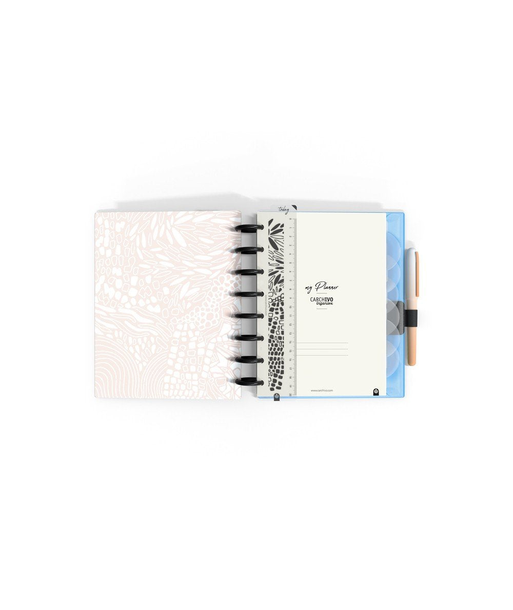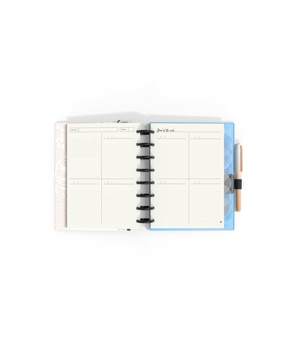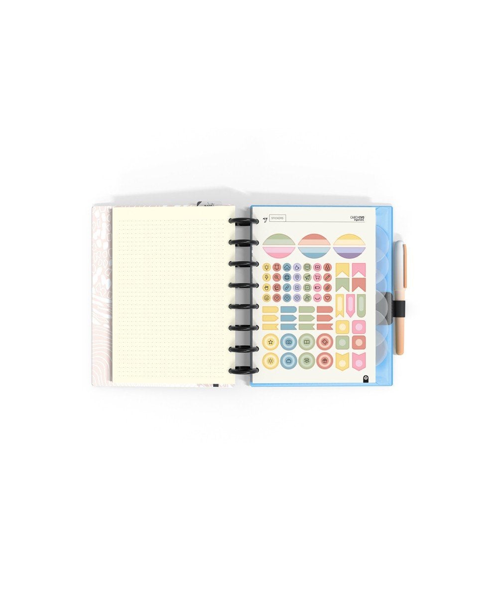 - El interior incluye: 14 meses planificación semanal, hojas organización semanal, hojas tracker de hábitos, hojas planificación anual, hoja de notas, 92 páginas papel escritura ( Dots, Predots y papel carta + calendarios 2022/23/24, regla 20cm, sobre PP cristal con cierre adherente, porta bolígrafo, 6 separadores de PP transparente serigrafiado, y 134 stickers