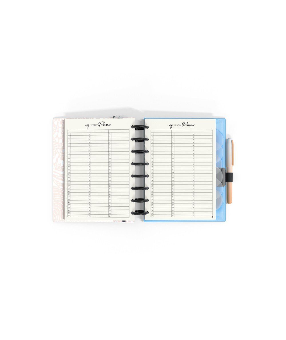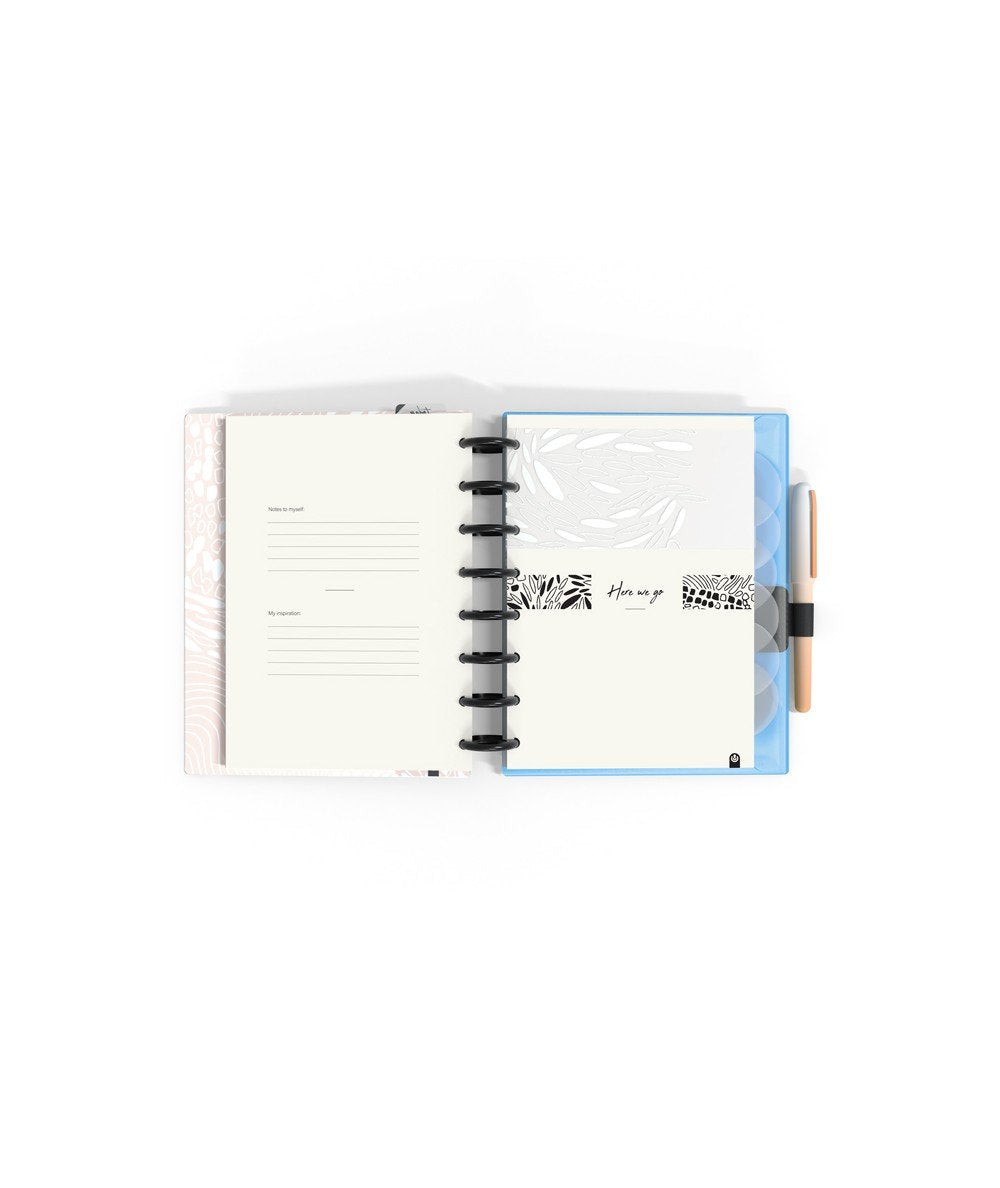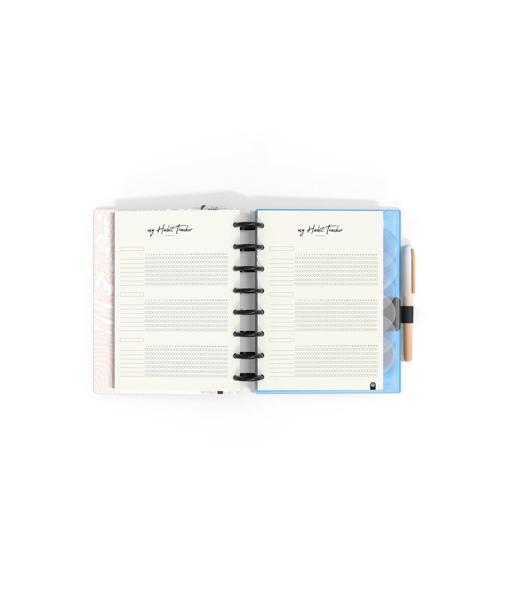 - El interior incluye: 14 meses planificación semanal, hojas organización semanal, hojas tracker de hábitos, hojas planificación anual, hoja de notas, 92 páginas papel escritura ( Dots, Predots y papel carta + calendarios 2022/23/24, regla 20cm, sobre PP cristal con cierre adherente, porta bolígrafo, 6 separadores de PP transparente serigrafiado, y 134 stickers