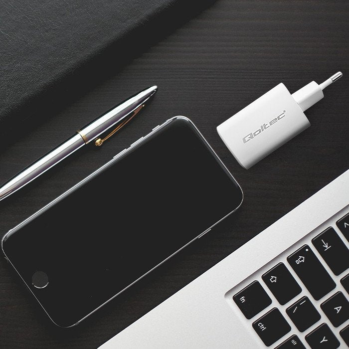 Qoltec 50765 cargador de dispositivo móvil Portátil, Consola de juegos portátil, Batería portátil, Smartphone, Reloj inteligente, Tableta Blanco Corriente alterna Carga rápida Interior