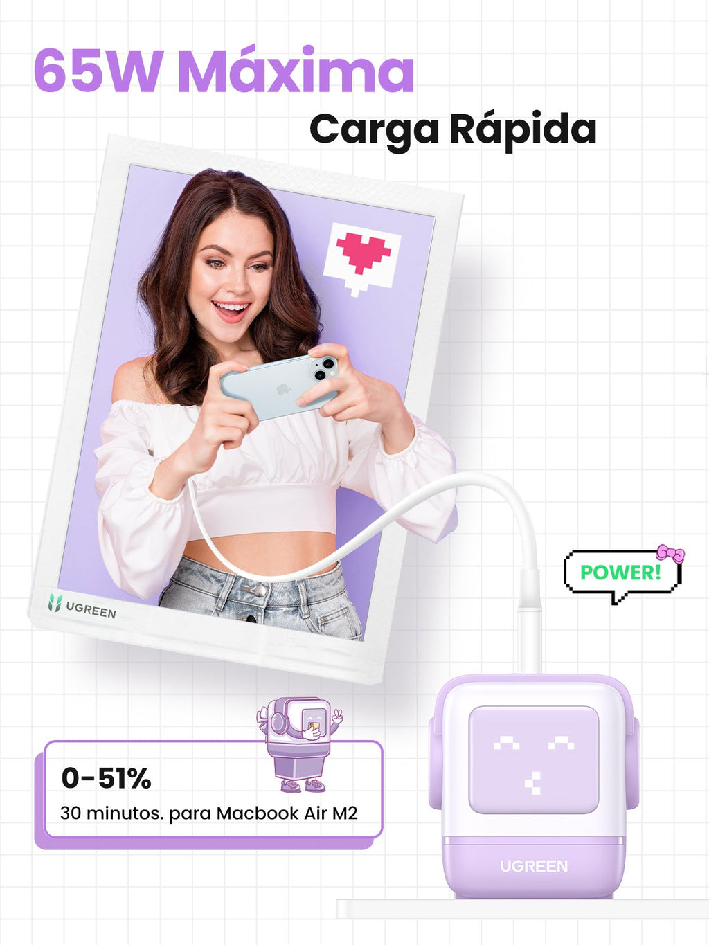 .Potente carregamento de 65 W: Para o MacBook Air M3, de 0 a 51 % em apenas 30 minutos com uma única porta USB C. Nota: Este produto não é um power bank.