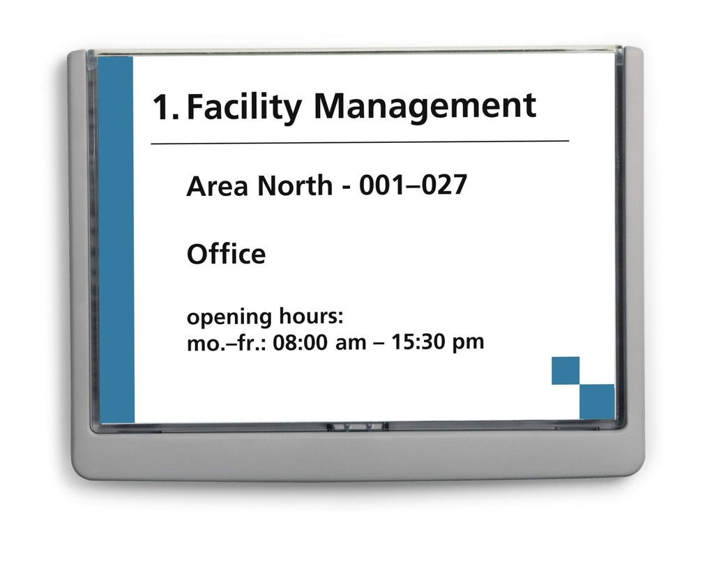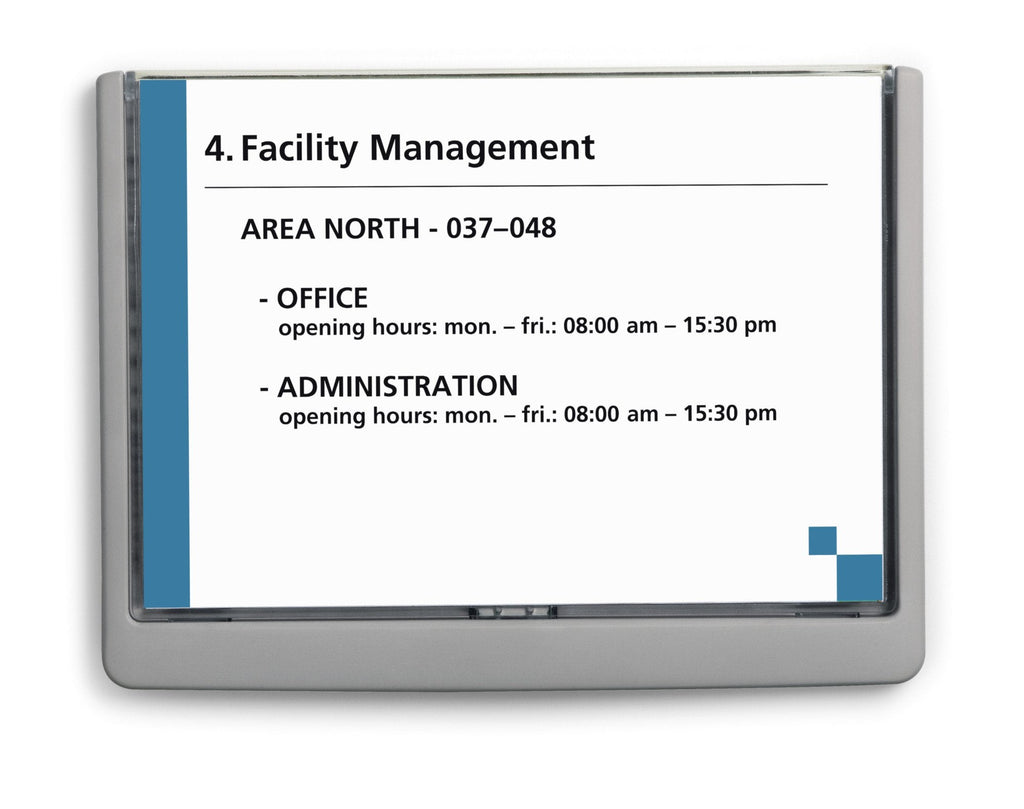 Identificadores para puertas color grafito que combinan diseño y funcionalidad. Ventanilla abatible para facilitar el cambio de etiqueta. Las etiquetas se cambian con facilidad simplemente abriendo y cerrando la ventanilla. Ideales en entornos donde la información se cambia con frecuencia, como hoteles y centros de conferencias. Se pueden pegar o atornillar a la pared. Incluye cartulina, material e instrucciones de montaje.
