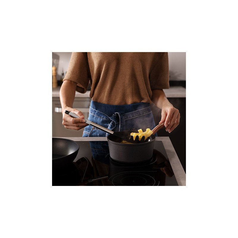 Cazo de 16 x 7,5 cm de aluminio forjado de 1,3 L de capacidad. Con revestimiento antiadherente de alta calidad Platinum Plus Teflon® Nonstick Coating, 100 % libre de PFOA. Mango remachado semiprofesional de acero inoxidable acabado en color oro rosa. Fondo difusor de calor Full Induction. Apto para horno hasta 230ºC sin tapa. Apto para lavar en el lavavajillas y para todo tipo de cocinas incluida inducción. Compuesto por 5 capas y con 4 mm de base para inducción.