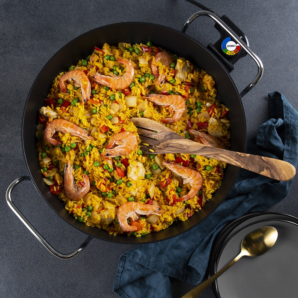 La cazuela Princess Multi Wonder Pro incluye una tapa de cristal con escape de vapor para que pueda vigilar el proceso de cocción. Gracias a sus prácticas espátulas de madera, podrá remover los alimentos de la cazuela sin que el revestimiento antiadherente sufra daños.