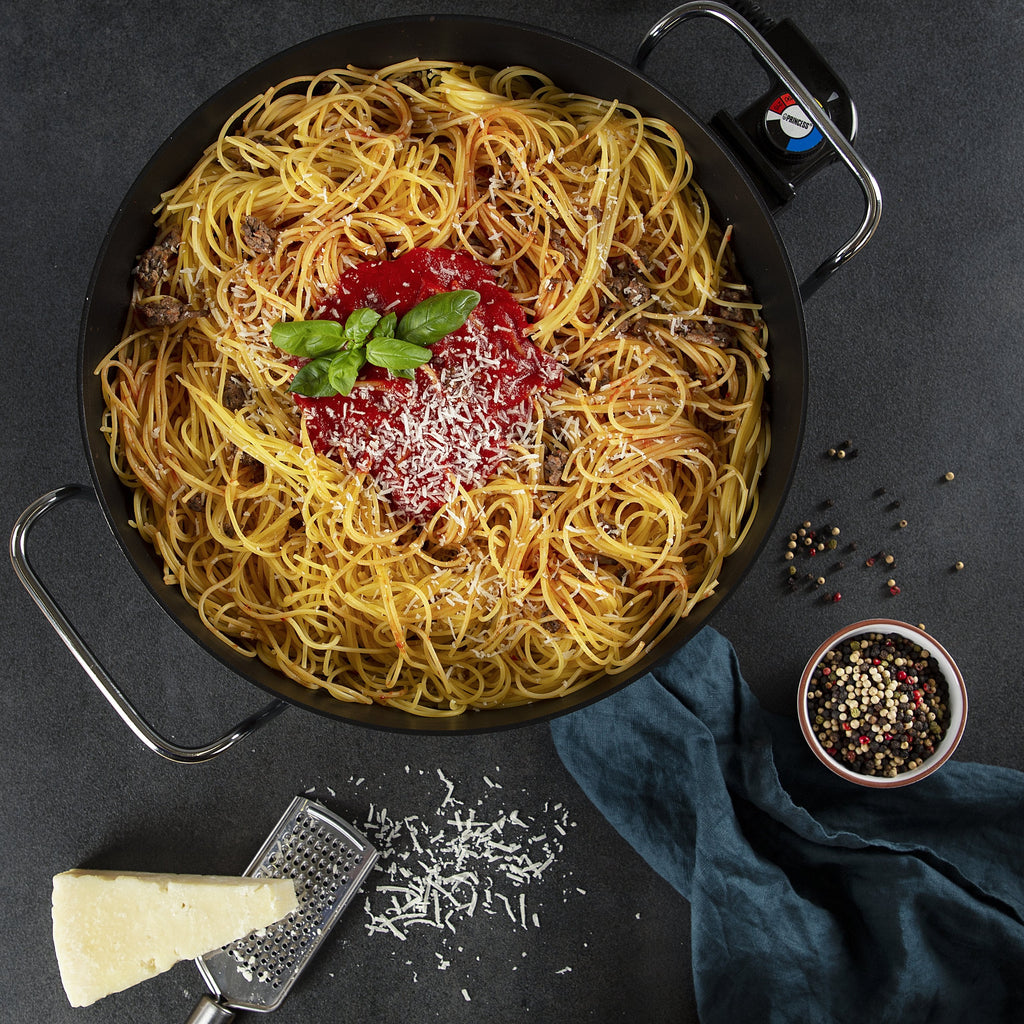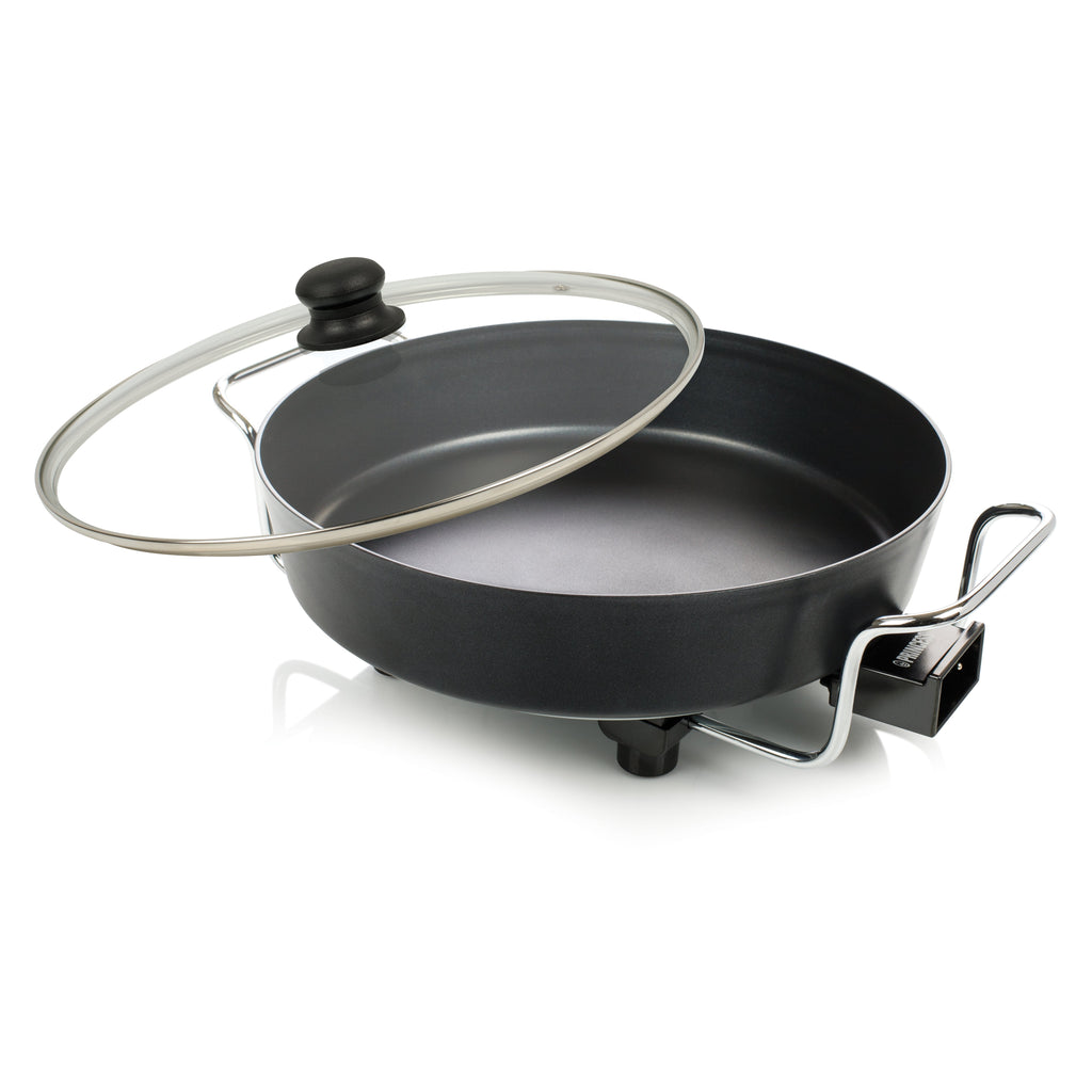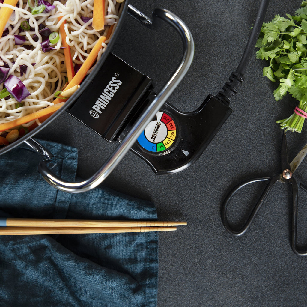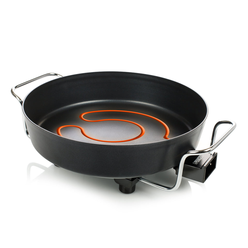 El cable de alimentación extraíble cuenta con un termostato ajustable para que pueda ajustar la temperatura óptima. De este modo, podrá utilizar la cazuela Princess Multi Wonder Chef Pro para freír rápidamente o para cocinar platos despacio, como un guiso de cerdo. El doble elemento calentador distribuye el calor de manera uniforme, por lo que ofrece unos resultados óptimos. La cazuela multiusos se conecta a la red eléctrica y es ideal para fiestas y barbacoas, ya que mantiene los platos y las salsas a la temperatura adecuada.