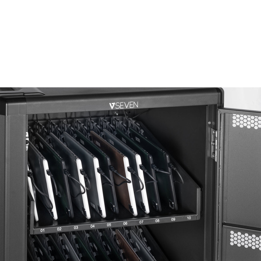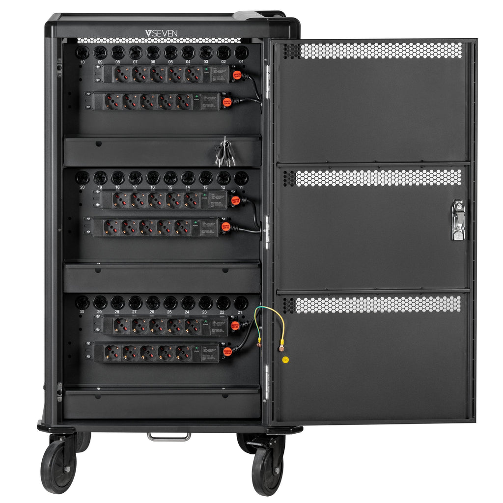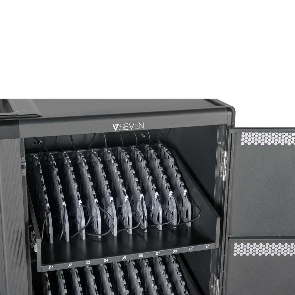Elimine el desorden y optimice la administración de dispositivos en su aula con el armario de carga V7. Esta sólida estación de carga móvil ofrece almacenamiento seguro y carga simultánea para hasta 30 Chromebooks, portátiles o tabletas con pantallas de hasta 17 pulgadas. Utilice el armario de carga sin esfuerzo directamente al sacarlo de la caja: viene premontado con compartimentos numerados para dispositivos y fuentes de alimentación. Un sistema de carga inteligente alimenta todo de forma segura desde un único enchufe, y el almacenamiento flexible con separadores ajustables se adapta a una variedad de dispositivos. Las ranuras numeradas mantienen el orden, y el diseño compacto cuenta con un tirador de empuje empotrado. El armario, fabricado para durar con acero de alta calidad, cuenta con puertas de ventilación para que circule el aire y un sistema de bloqueo de 3 puntos al que se puede añadir un candado para mayor seguridad. El armario de carga V7 es perfecto para las aulas y mantiene sus dispositivos encendidos, organizados y listos para usar.