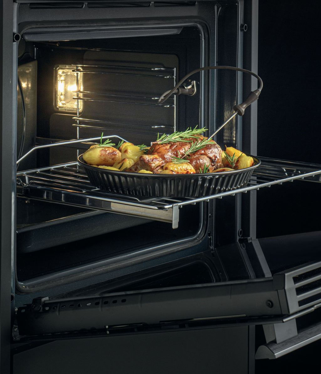 Las guías telescópicas han sido diseñadas para que la extracción de las bandejas sea más fácil que nunca, para que puedas comprobar el progreso de la cocción en cualquier momento y reemplazar las bandejas sin dejar la puerta del horno abierta más tiempo del necesario. Una mayor facilidad de uso significa una menor pérdida del calor y por lo tanto, mayor eficiencia.