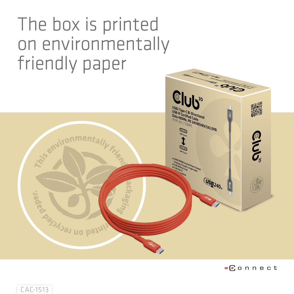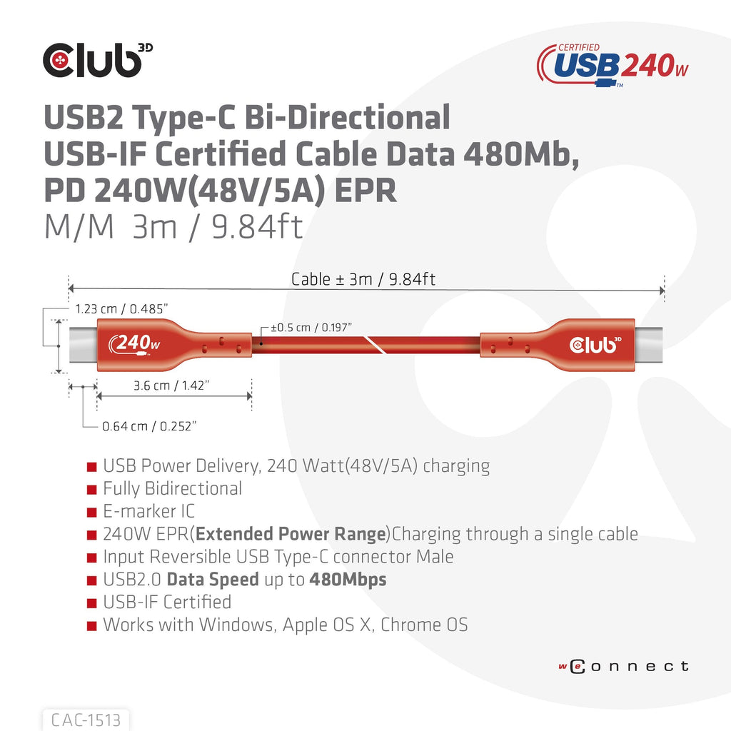 El cable certificado Club 3D CAC-1513 USB 2.0 tipo C bidireccional USB-IF, datos 480 Mb, PD 240 W (48 V/5 A) EPR, rango de potencia extendido M/M 3