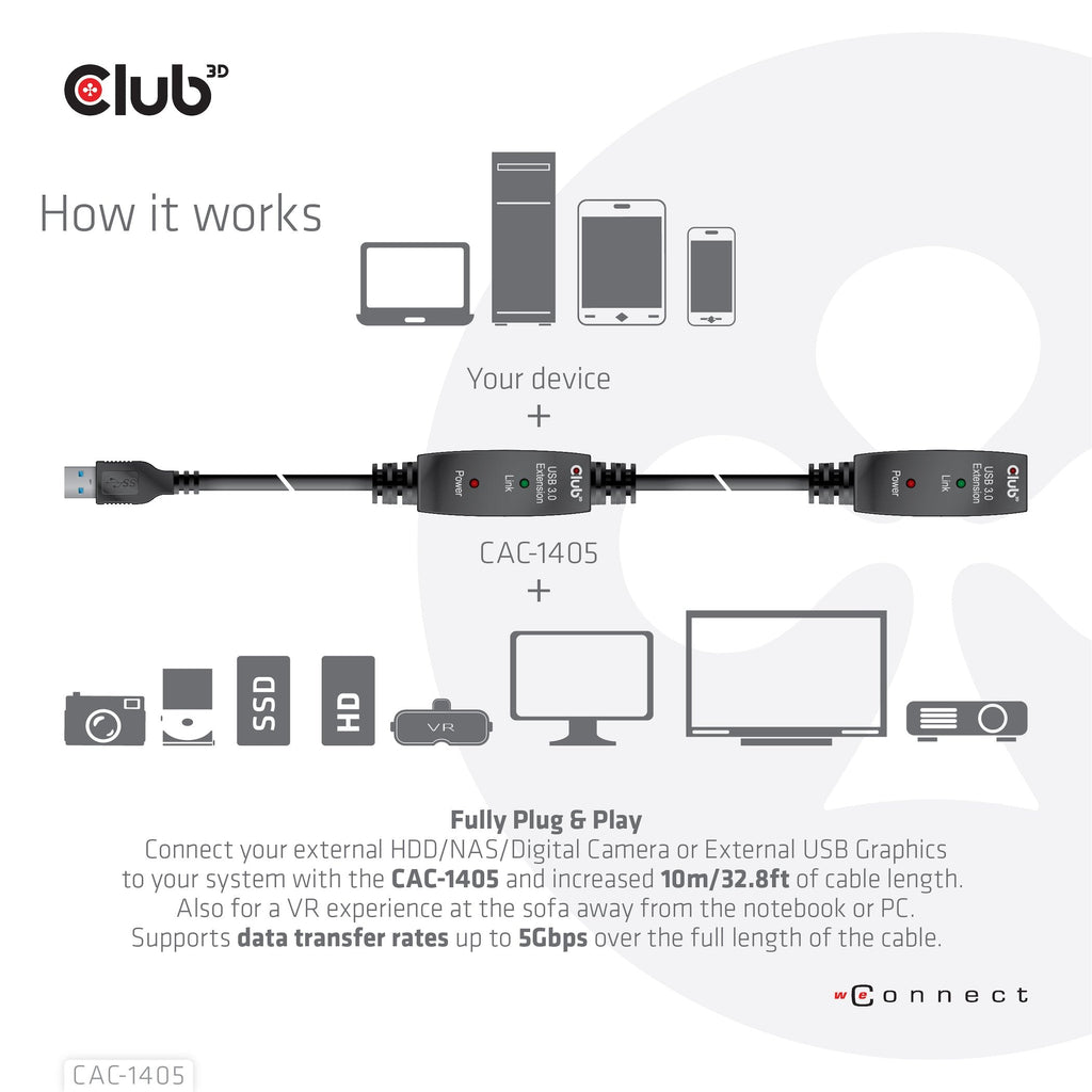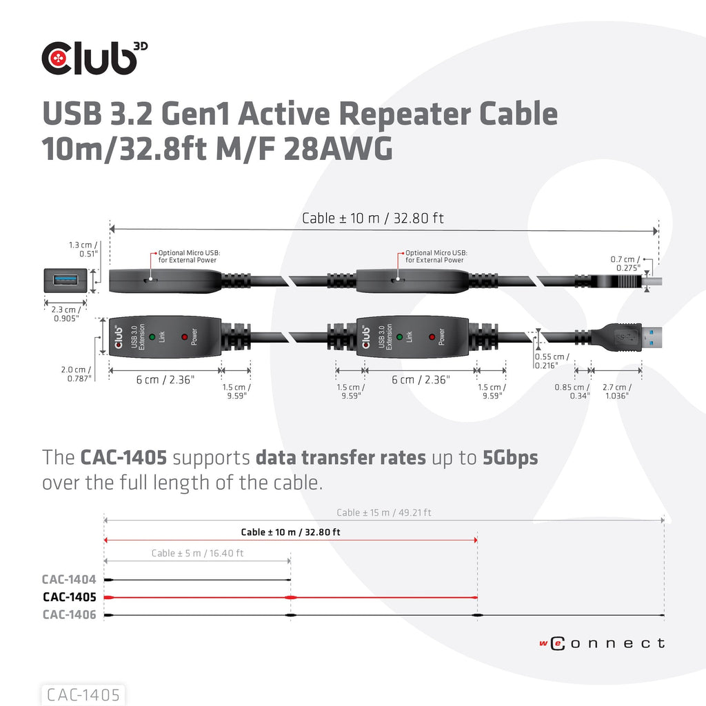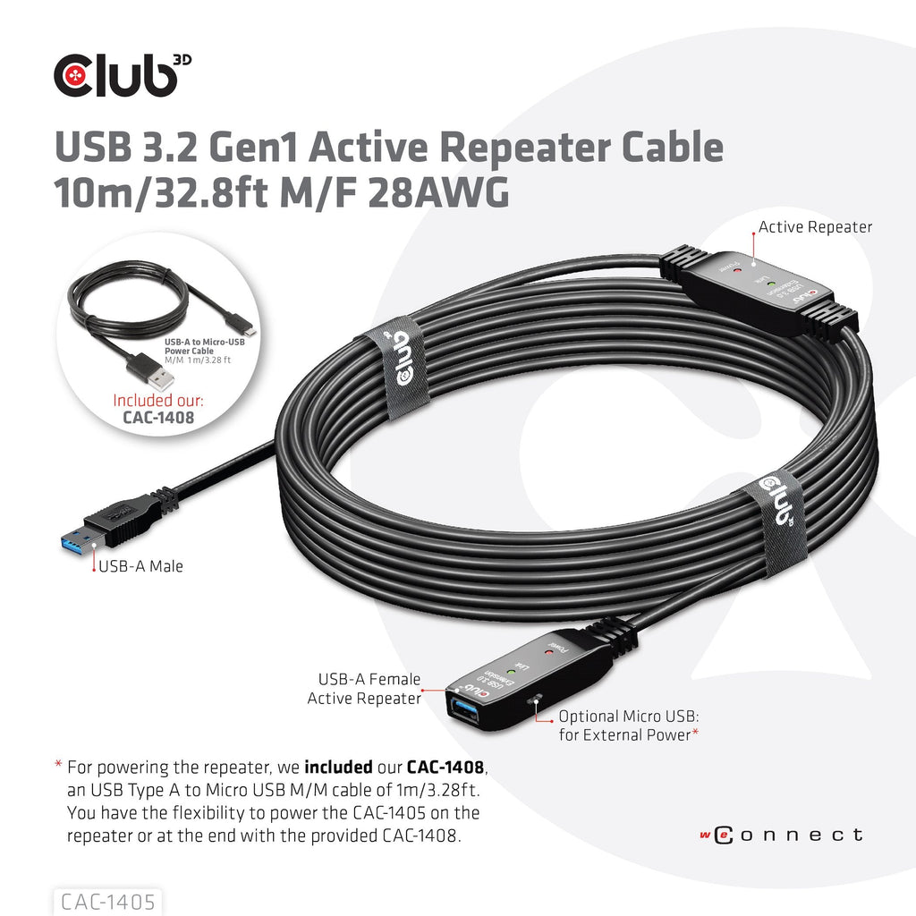 CLUB3D CAC-1405, 10 m, USB A, USB A, USB 3.2 Gen 2 (3.1 Gen 2), Negro