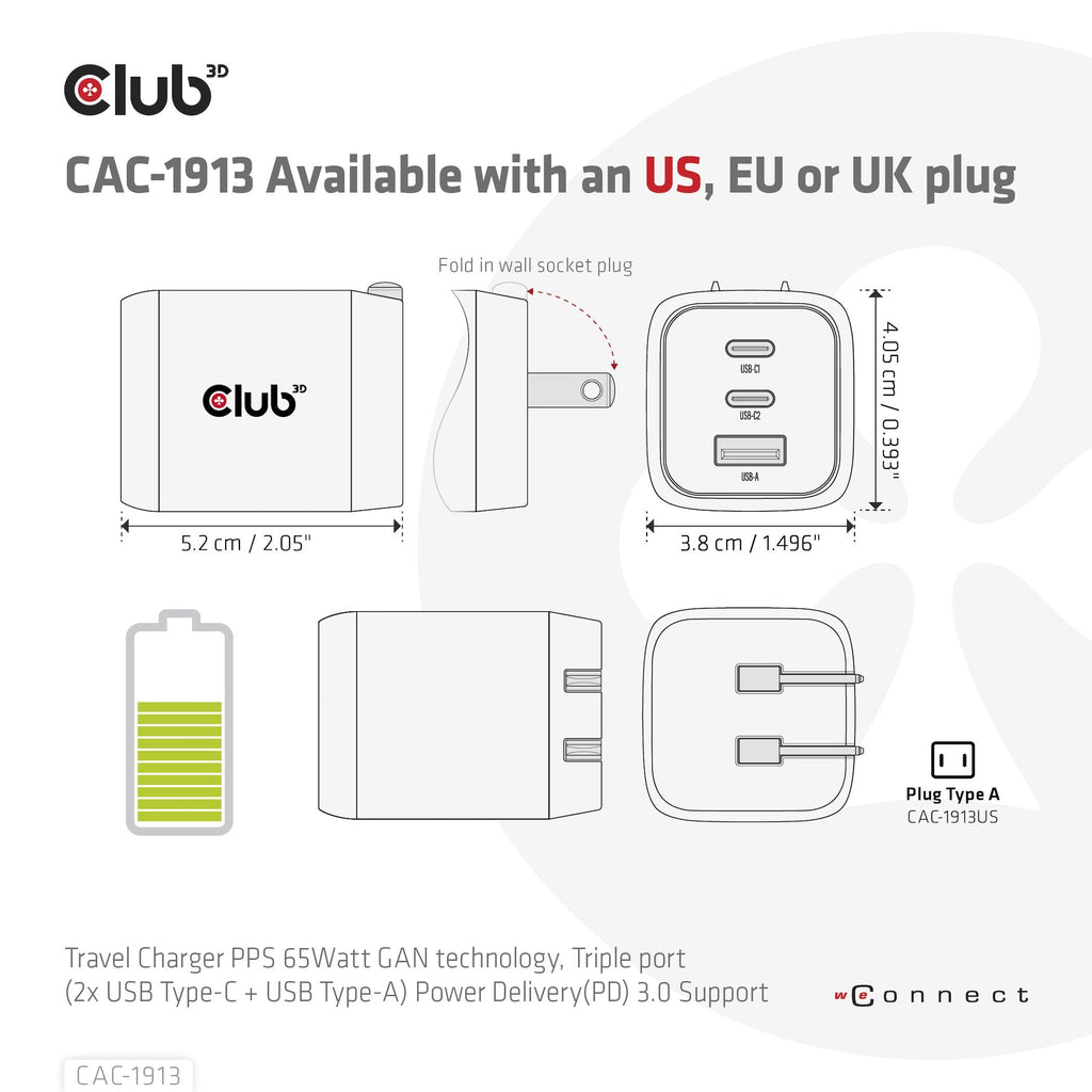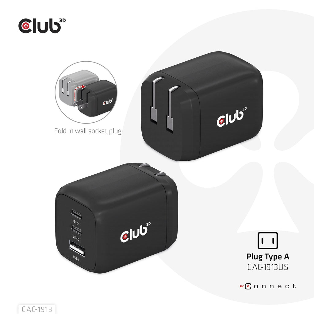 El cargador de viaje Club3D CAC-1913 Tecnología PPS 65Watt GAN, puerto triple