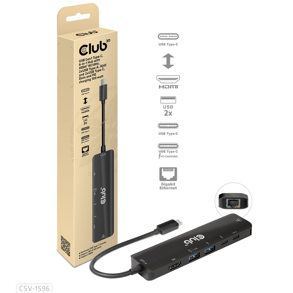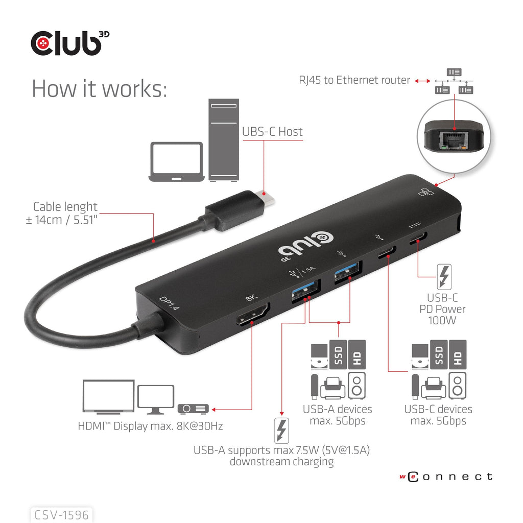 CLUB3D CSV-1596, USB 3.2 Gen 1 (3.1 Gen 1) Type-C, 100 W, 1.4/2.3, 100,1000 Mbit/s, Negro, 8K Ultra HD