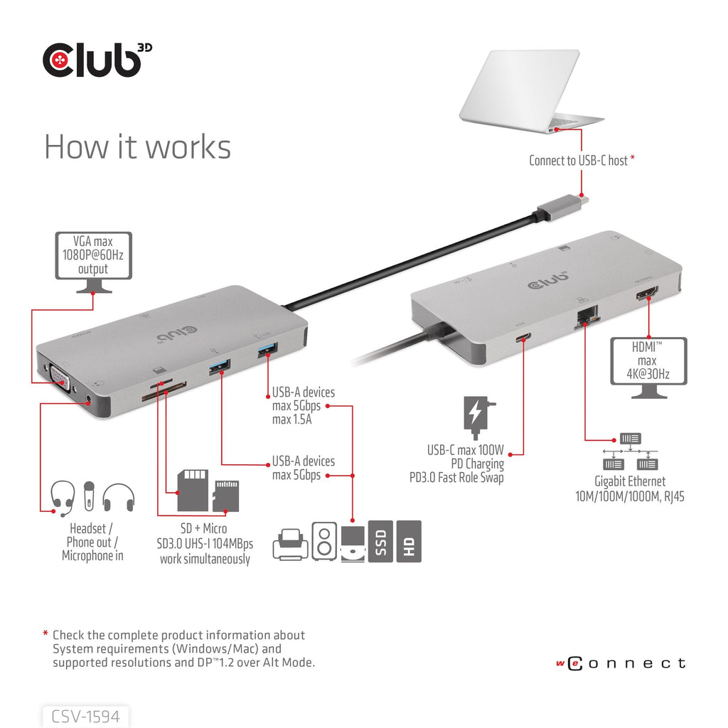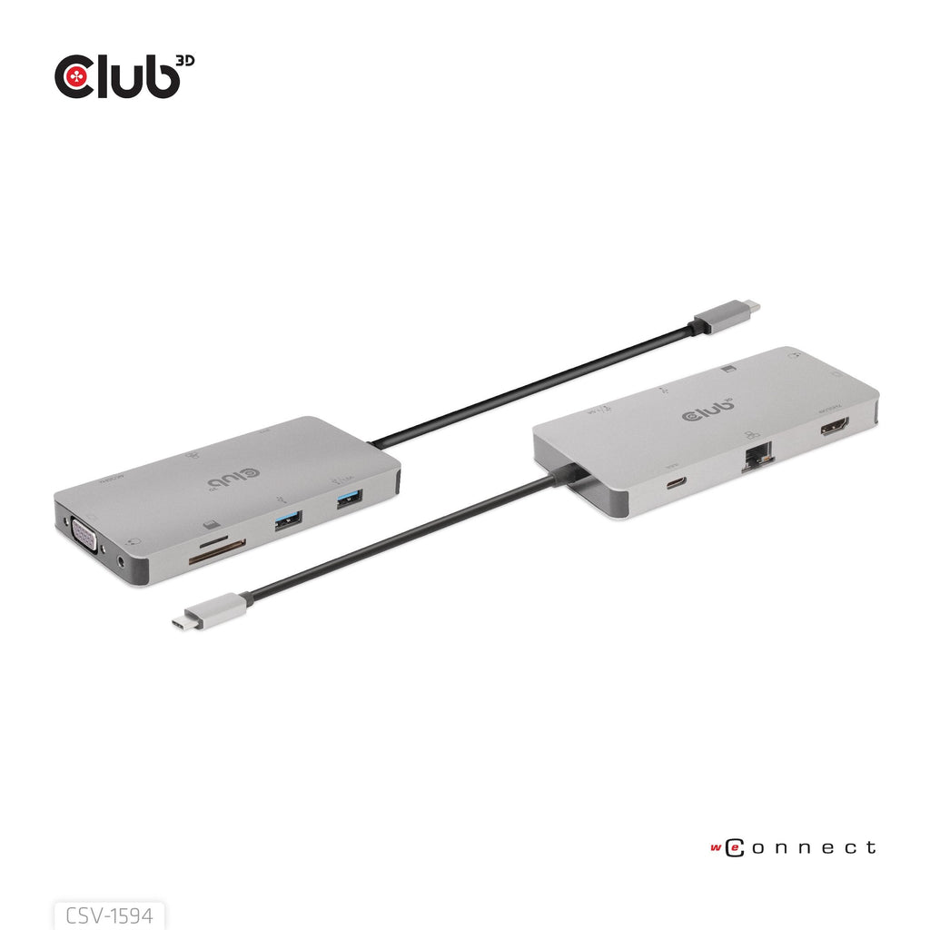 CLUB3D CSV-1594, USB 3.2 Gen 1 (3.1 Gen 1) Type-C, 100 W, 10,100,1000 Mbit/s, Negro, Gris, MicroSD (TransFlash), SD, 60 Hz