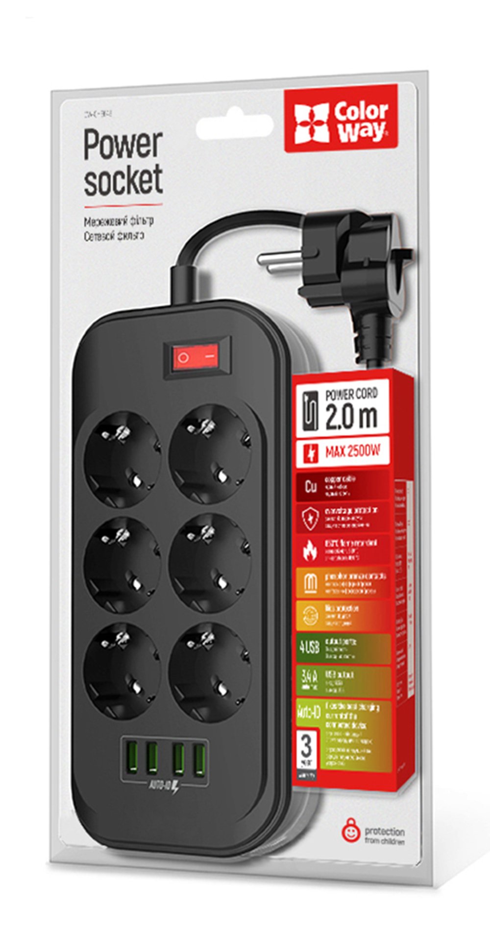 Colorway CW-CHE64B base múltiple 2 m 6 salidas AC Interior Negro