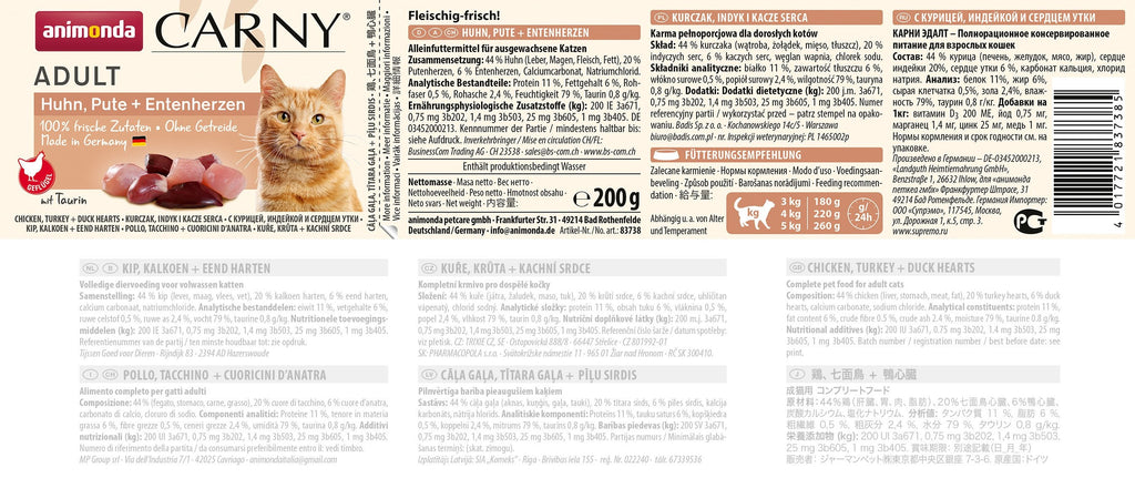 animonda Carny chicken, turkey + duck hearts, Adulto, Pollo, Pato, Corazón, Pavo, 200 g, Sin cereales, No contiene soja