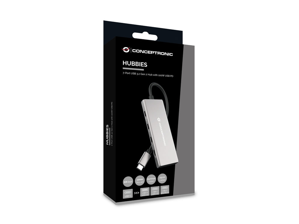 Conceptronic HUBBIES17G, USB 3.2 Gen 2 (3.1 Gen 2) Type-C, USB 3.2 Gen 2 (3.1 Gen 2) Type-A, USB 3.2 Gen 2 (3.1 Gen 2) Type-C, 10000 Mbit/s, Gris, Aluminio, 100 W