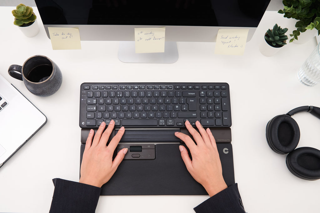 SliderMouse Pro combina un aspecto elegante y minimalista con un diseño ergonómico que reduce las molestias y la incomodidad cuando se trabajan muchas horas delante del ordenador. Al ser un ratón centrado, mantiene tus brazos en una posición natural delante de ti, sin necesidad de estirarlos y sin tensiones. El sistema de navegación con almohadilla deslizante es intuitivo y familiar, puesto que funciona en gran medida como una almohadilla táctil (touchpad). La almohadilla deslizante es ambidiestra, y elimina la sujeción incómoda y el agarre que requieren un ratón tradicional.