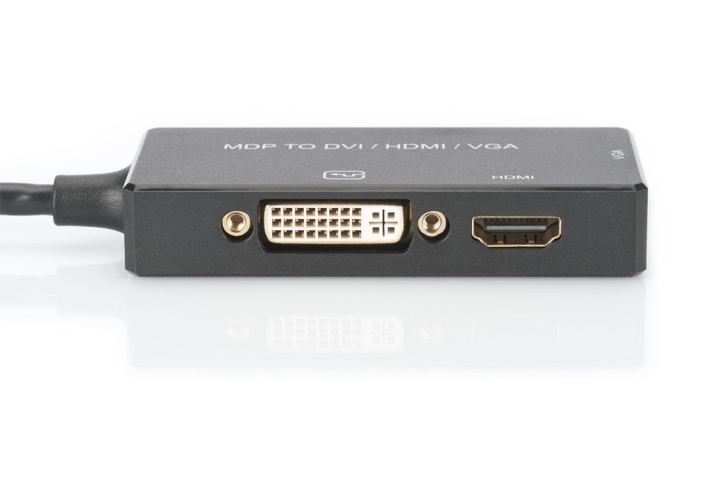 Este adaptador le permite visualizar su ordenador de sobremesa o portátil con DisplayPort en una pantalla con una conexión HDMI, DVI o VGA. Es ideal cuando tiene que conectar diferentes aparatos de reproducción, por ejemplo para para agentes comerciales que se encuentran con conexiones diferentes en distintas salas de conferencias. También es útil para el uso privado, para poder utilizar monitores y televisores con diferentes entradas. El cable adaptador convierte la señal del DisplayPort en señales HDMI, DVI o VGA. Plug & Play: funciona sin instalación de controladores y el suministro de corrientes se realiza a través de la interfaz DisplayPort.