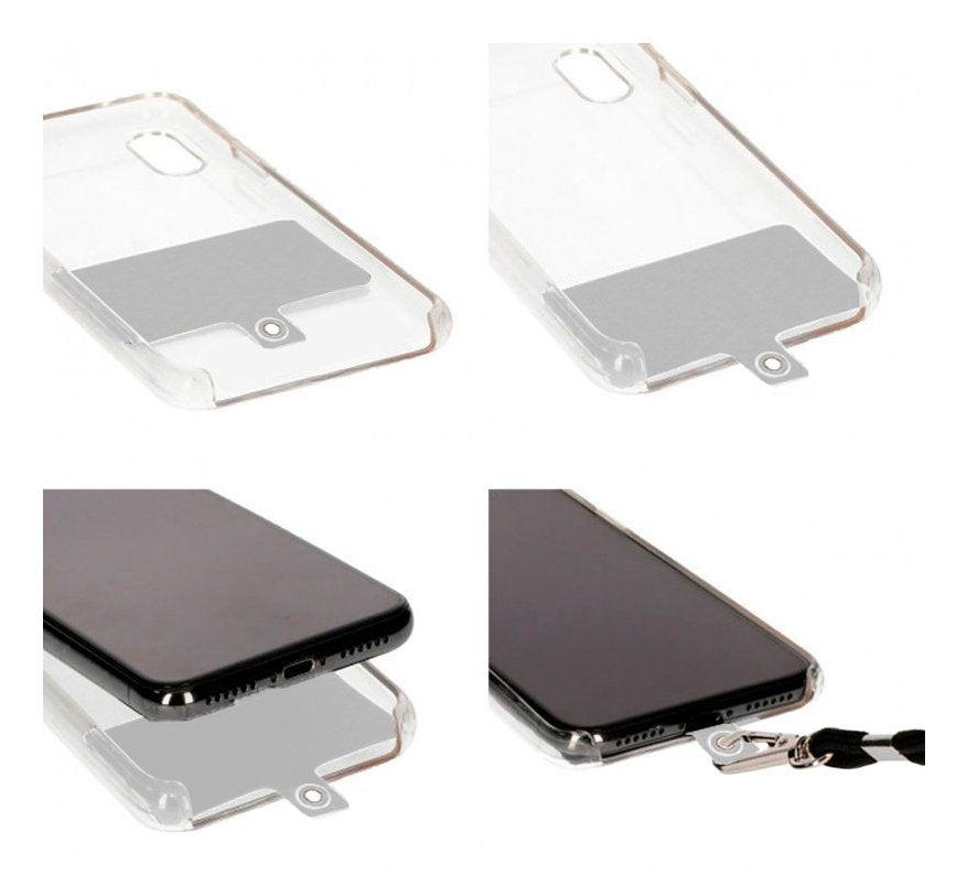 Con sistema de fijación mediante una tarjeta de plástico (incluída) que se introduce en la funda o carcasa del smartphone, y de la que sale una pieza de plástico a la que se engancha el cordón.