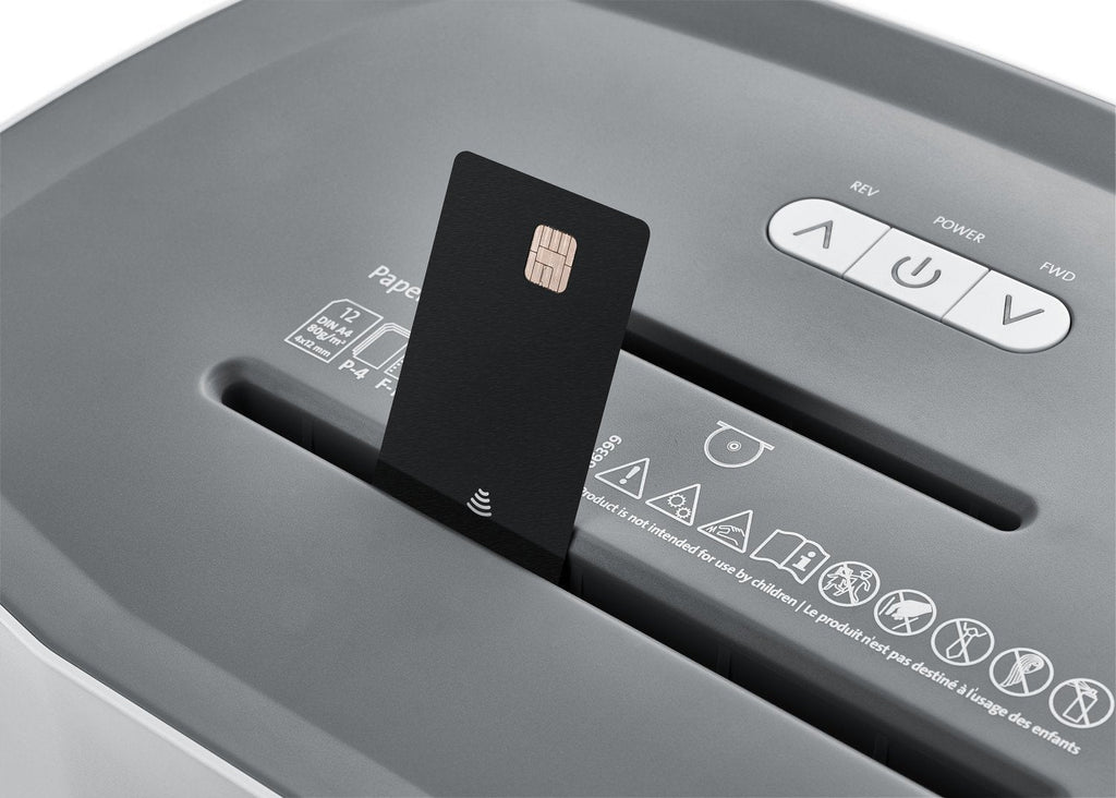 Corte en partículas. Destrucción de documentos cómoda y ecológica sin tener que perder tiempo con la lubricación de los rodillos de corte. Destruye tarjetas de forma fiable. Destruye de forma fiable CD y DVD. Cable de alimentación acodado. Dos mecanismos de corte por separado para papel, CD, DVD, tarjetas de débito y de crédito. Gracias a las minúsculas partículas se aprovecha de manera óptima el volumen del depósito. Sencilla separación de residuos gracias a los depósitos individuales para CD, DVD, tarjetas de débito y de crédito.