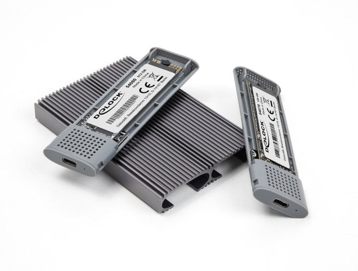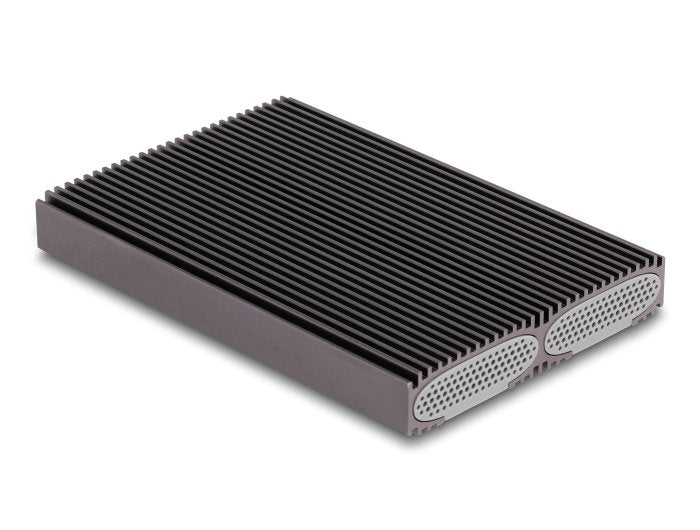 Esta caja de Delock permite la instalación de dos SSD M.2, que se pueden utilizar y operar en SSD M.2 PCIe NVMe o SSD M.2 SATA en formato 2280, 2260, 2242 y 2230. La robusta carcasa metálica con aletas de refrigeración garantiza una temperatura óptima de la memoria.