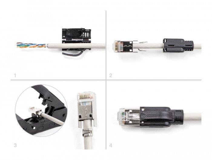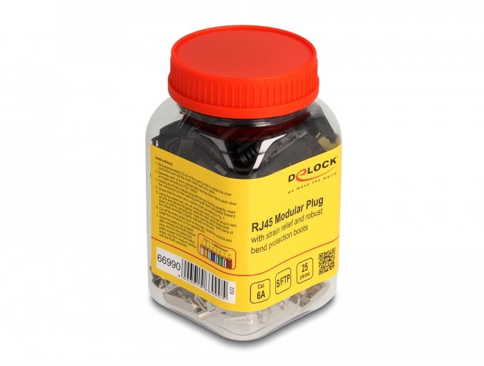 Este juego de machos RJ45 de alta calidad de Delock incluye enchufes macho RJ45 apantallados con alivio de tensión, protectores contra dobleces y un gestor de cables para una instalación óptima de cables con 26 AWG.