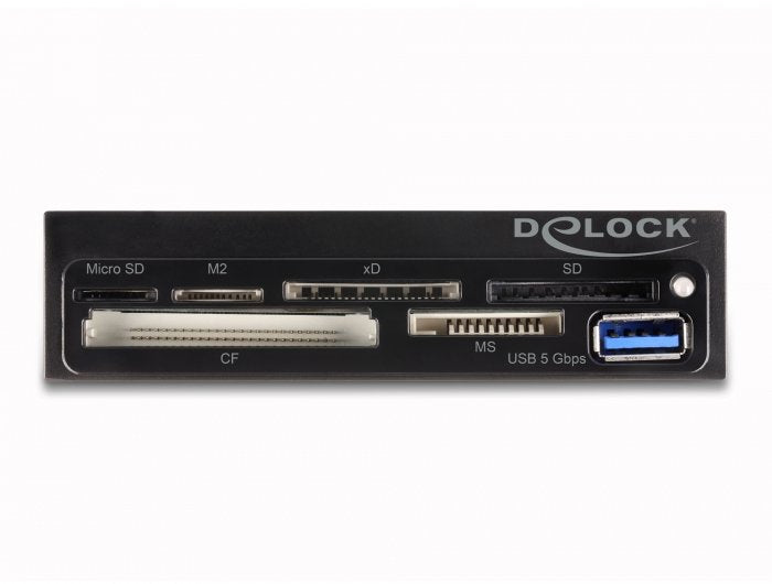 Este lector de tarjetas de Delock se puede instalar en una bahía libre de 3.5″ de un PC y se conectará a un puerto de cabecera de pines USB. Ofrece seis ranuras de lectura de tarjetas diferentes y permite la conexión de un dispositivo USB.