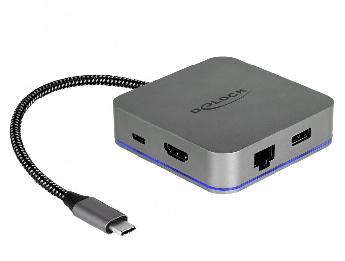 Puede conectarse esta estación de acoplamiento de Delock a un dispositivo móvil con un puerto USB-C™ DP Alt Mode o Thunderbolt™ 3, por lo que proporciona una variedad de interfaces. Se puede utilizar un monitor en la salida HDMI. Tres puertos USB incorporados permiten el uso de periféricos. El puerto de red gigabit permite la conexión a la red. Suministro de potencia USB (USB PD 3.0) admite hasta 87 vatios La estación de acoplamiento tiene un puerto de suministro de energía USB Type-C™ para conectar la fuente de alimentación de la computadora portátil o tableta para cargarla. Además, también suministra alimentación a los puertos USB. La estación de acoplamiento también se puede utilizar sin una fuente de alimentación. Iluminación de diseño LED En cuanto se conecta la estación de conexión a través del enchufe USB-C™, se enciende un LED en el borde inferior en un diseño único. Pequeño ayudante robusto Gracias a sus pequeñas dimensiones y su robusta carcasa, esta estación de acoplamiento de Delock es especialmente adecuada para viajar. Simplemente se puede empaquetar en la bolsa junto con la computadora portátil o tablet y se puede utilizar según sea necesario.