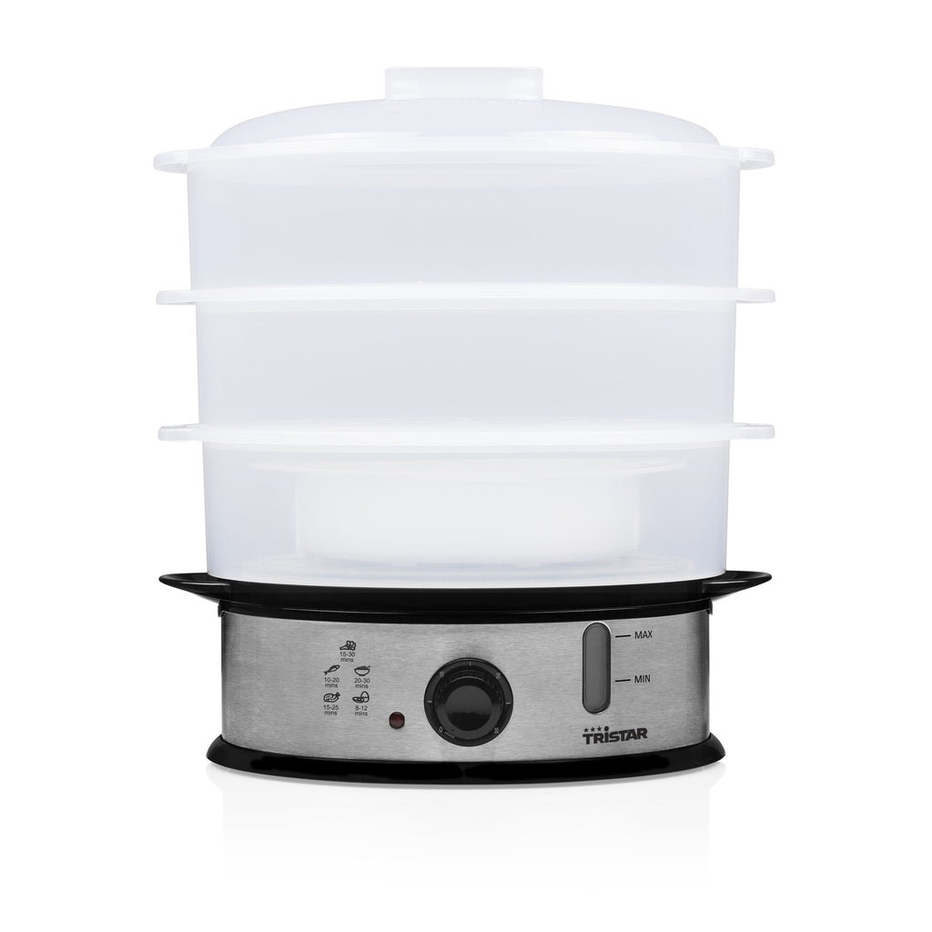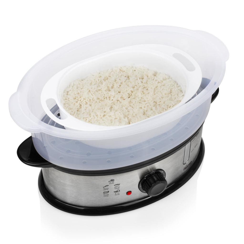 Cocedora a vapor Tristar, 3 capas de plástico, cesta para arroz, tapa con salida de vapor, manual de instrucciones