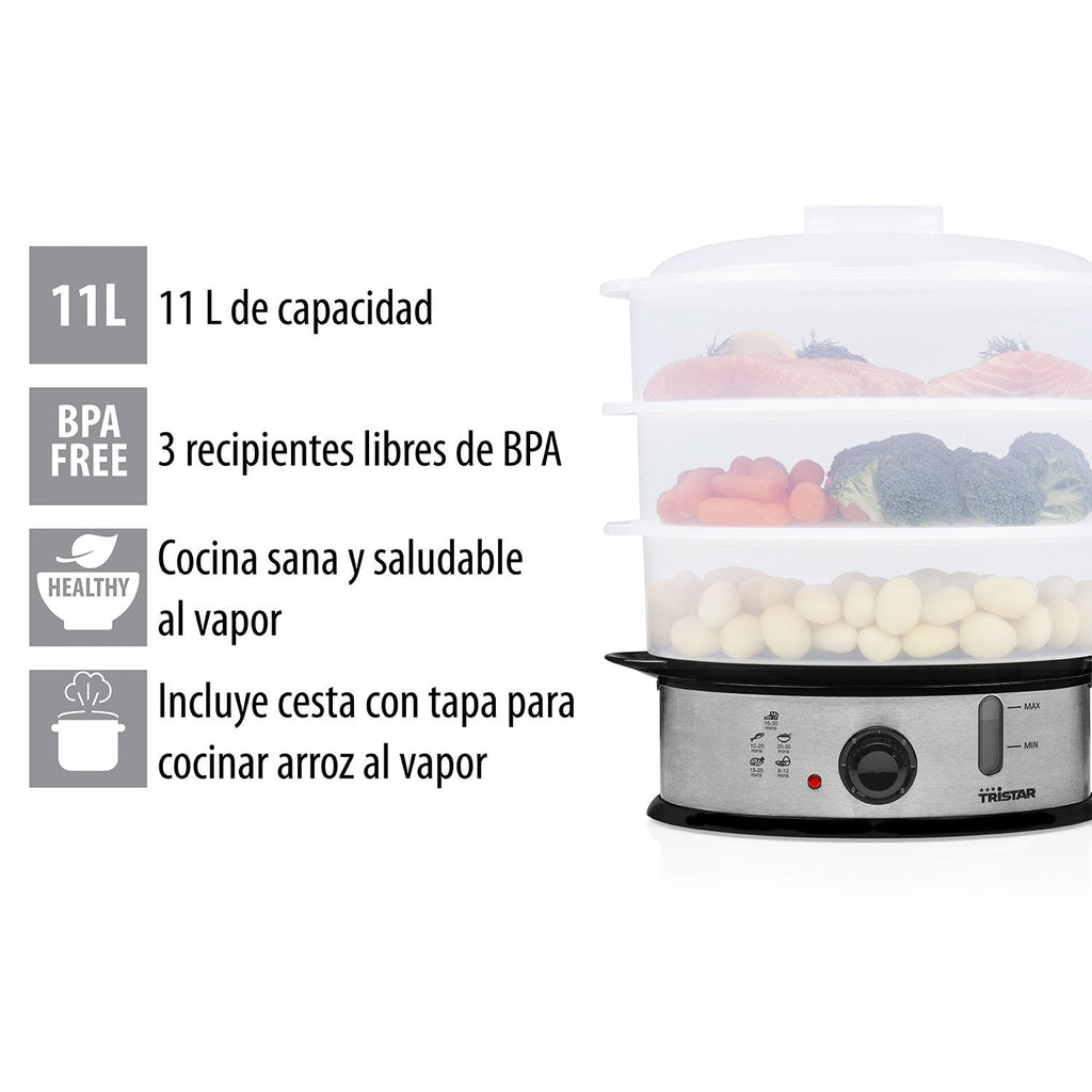 La cocedora a vapor Tristar dispone de 3 capas, por lo que podrá preparar un menú completo de una sola vez. Puede incluso cocinar arroz al vapor en la cesta incluida. Todas las piezas están fabricadas con plástico sin BPA, por lo que no se liberarán partículas a los alimentos. Prepare platos saludables repletos de sabor fácilmente.
