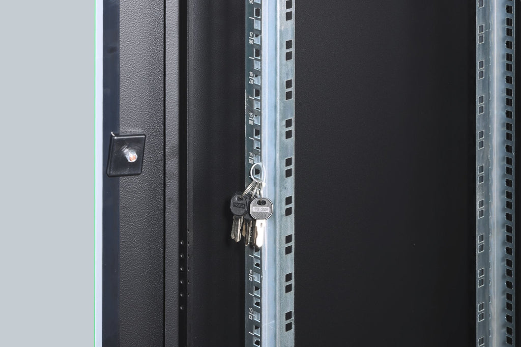 Los armarios de red de la serie Unique se han diseñado y fabricado para un cableado de red especialmente cómodo y flexible. Las sofisticadas optimizaciones ofrecen una estabilidad acorde con el mercado con la máxima flexibilidad. Un chasis base modular, que puede abrirse mediante paneles ciegos atornillados de 483 mm (19"), ofrece espacio suficiente para cables de todo tipo. Las tiras de cepillo traseras por encima y por debajo de la puerta trasera (a partir de 26U) permiten el uso en una amplia gama de escenarios de aplicación. Los amplios conductos de cables verticales con ayudas para el guiado de cables y tapa, instalados en la parte delantera (a partir de 800 mm de ancho de armario), completan a la perfección las versátiles características del armario de red. En el interior hay instalados dos pares de carriles de perfil de 483 mm (19") galvanizados y con manivela, etiquetados con unidades de altura que pueden leerse en direcciones opuestas. Se pueden ajustar de forma continua y están conectados a puntales de profundidad adicionales en el armario. Cada armario es una robusta construcción de chapa de acero de hasta 1,5 mm de grosor. La coloración se realiza mediante recubrimiento electrostático en polvo en los colores estándar gris (RAL 7035) y negro (RAL 9005). Los paneles laterales y las puertas modulares con cerradura y extraíbles mejoran la accesibilidad. Las bisagras de las puertas pueden cambiarse. Además, los armarios pueden desmontarse completamente en caso necesario gracias a su diseño desmontable.