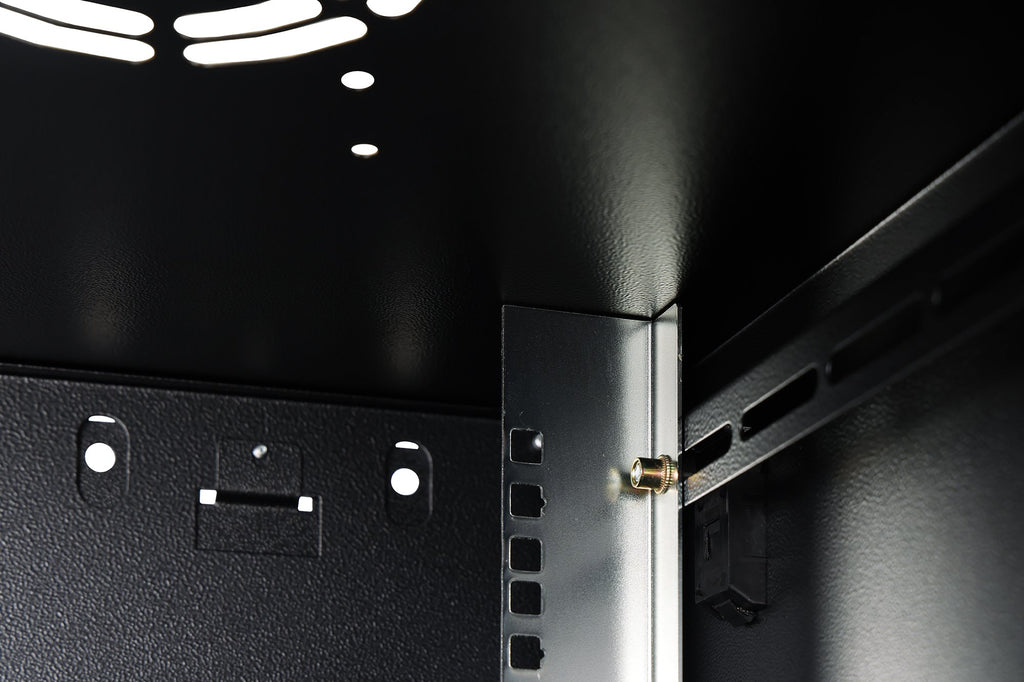 - Carriles de perfil de 483 mm (19'') instalados en la parte delantera y trasera del armario, galvanizados