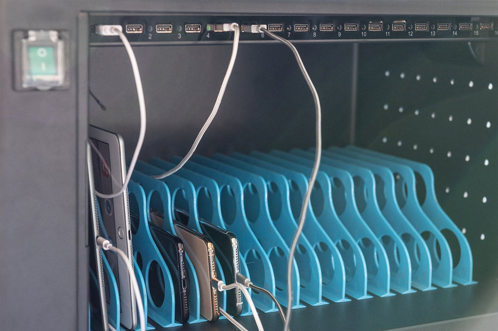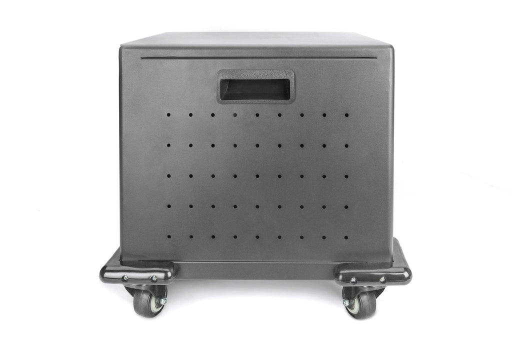El armario de carga móvil de DIGITUS® es la solución ideal y compacta para almacenar y cargar sus dispositivos portátiles, como ordenadores portátiles y tabletas. Los armarios de carga móviles suelen utilizarse en instalaciones públicas como colegios para almacenar y cargar dispositivos de forma segura en una ubicación central. El armario contiene 16 estaciones de carga, cada una de ellas con su propio puerto USB en la parte frontal. Un ventilador integrado (24 V) junto con las ranuras de ventilación garantizan la refrigeración activa del armario.